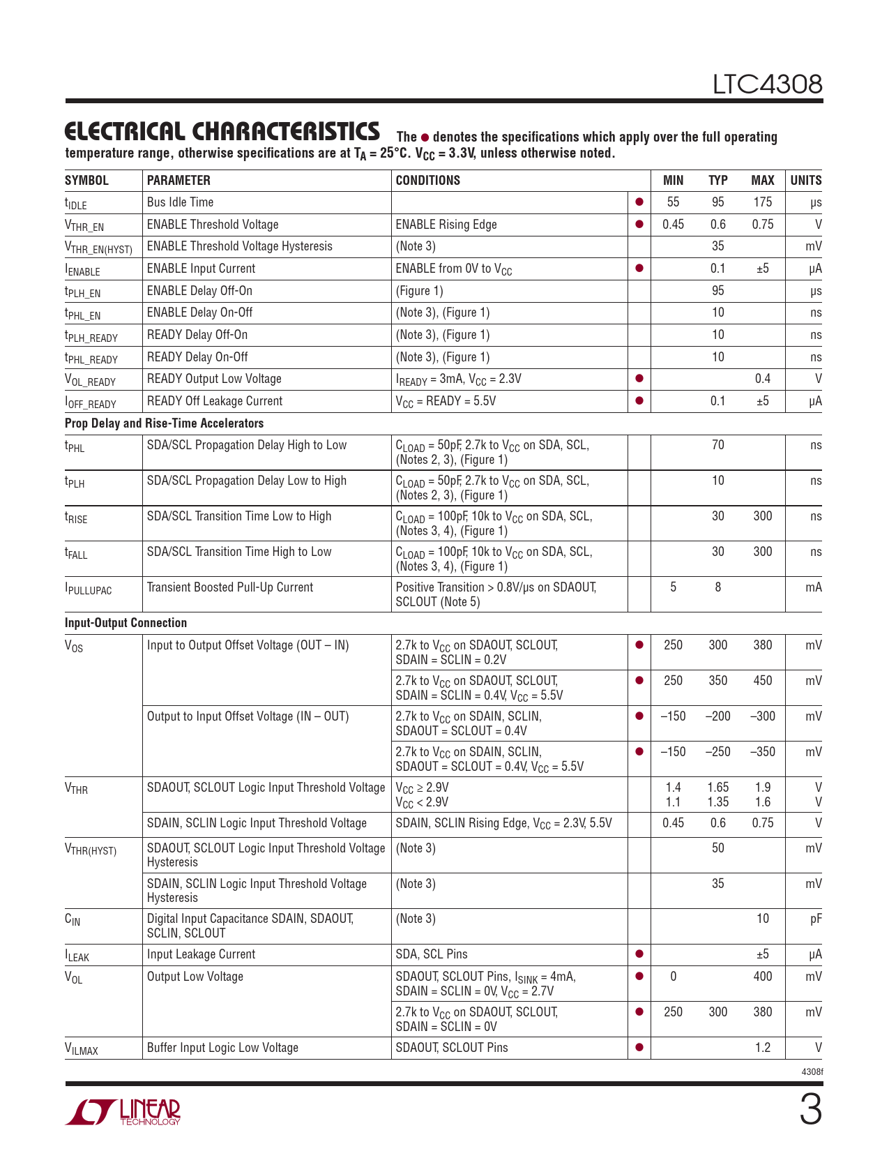 VOS Input to Output Offset Voltage (OUT – IN) 2.7k to VCC on SDAOUT, SCLOUT, l 250 300 380 mV SDAIN = SCLIN = 0.2V 2.7k to VCC on SDAOUT, SCLOUT, l 250 350 450 mV SDAIN = SCLIN = 0.4V, VCC = 5.5V Output to Input Offset Voltage (IN – OUT) 2.7k to VCC on SDAIN, SCLIN, l –150 –200 –300 mV SDAOUT = SCLOUT = 0.4V 2.7k to VCC on SDAIN, SCLIN, l –150 –250 –350 mV SDAOUT = SCLOUT = 0.4V, VCC = 5.5V VTHR SDAOUT, SCLOUT Logic Input Threshold Voltage VCC ≥ 2.9V 1.4 1.65 1.9 V VCC < 2.9V 1.1 1.35 1.6 V SDAIN, SCLIN Logic Input Threshold Voltage SDAIN, SCLIN Rising Edge, VCC = 2.3V, 5.5V 0.45 0.6 0.75 V VTHR(HYST) SDAOUT, SCLOUT Logic Input Threshold Voltage (Note 3) 50 mV Hysteresis SDAIN, SCLIN Logic Input Threshold Voltage (Note 3) 35 mV Hysteresis CIN Digital Input Capacitance SDAIN, SDAOUT, (Note 3) 10 pF SCLIN, SCLOUT ILEAK Input Leakage Current SDA, SCL Pins l ±5 μA VOL Output Low Voltage SDAOUT, SCLOUT Pins, ISINK = 4mA, l 0 400 mV SDAIN = SCLIN = 0V, VCC = 2.7V 2.7k to VCC on SDAOUT, SCLOUT, l 250 300 380 mV SDAIN = SCLIN = 0V VILMAX Buffer Input Logic Low Voltage SDAOUT, SCLOUT Pins l 1.2 V 4308f 3