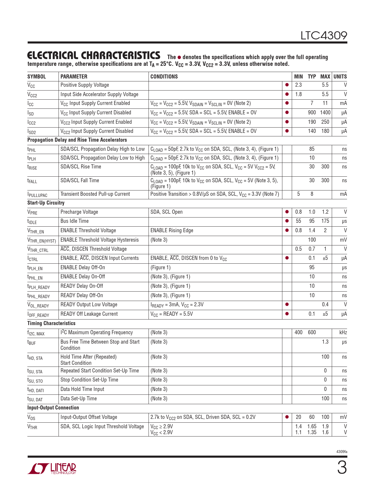 denotes the specifi cations which apply over the full operating temperature range, otherwise specifi cations are at TA = 25°C. VCC = 3.3V, VCC2 = 3.3V, unless otherwise noted. SYMBOL PARAMETER CONDITIONS MIN TYP MAX UNITS