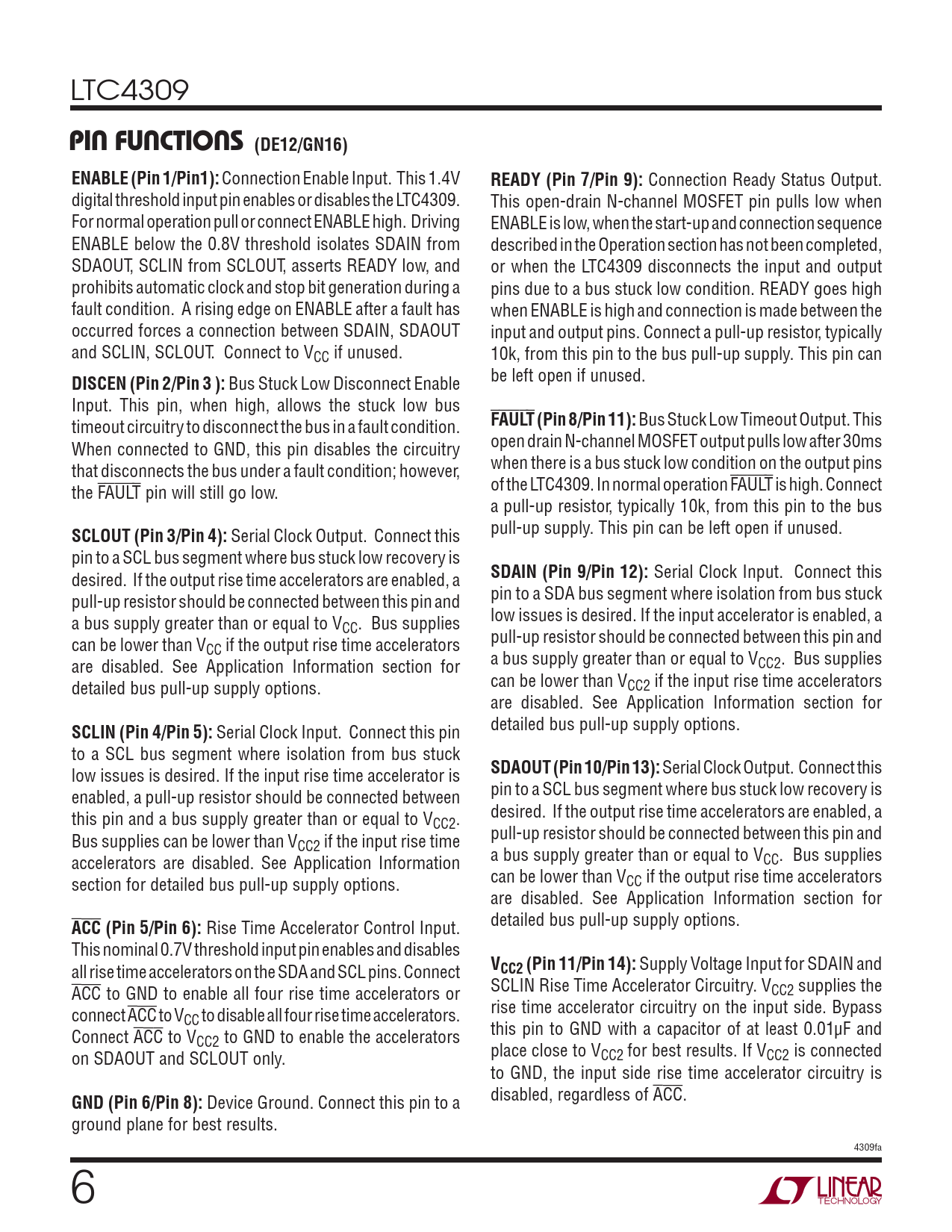 Connection Ready Status Output. digital threshold input pin enables or disables the LTC4309. This open-drain N-channel MOSFET pin pulls low when For normal operation pull or connect ENABLE high. Driving ENABLE is low, when the start-up and connection sequence ENABLE below the 0.8V threshold isolates SDAIN from described in the Operation section has not been completed, SDAOUT, SCLIN from SCLOUT, asserts READY low, and or when the LTC4309 disconnects the input and output prohibits automatic clock and stop bit generation during a pins due to a bus stuck low condition. READY goes high fault condition. A rising edge on ENABLE after a fault has when ENABLE is high and connection is made between the occurred forces a connection between SDAIN, SDAOUT input and output pins. Connect a pull-up resistor, typically and SCLIN, SCLOUT. Connect to VCC if unused. 10k, from this pin to the bus pull-up supply. This pin can