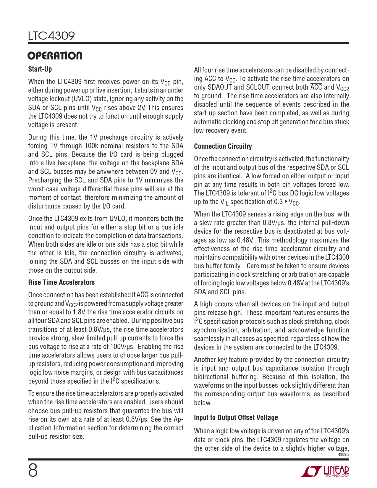 All four rise time accelerators can be disabled by connect- When the LTC4309 fi rst receives power on its V ing ACC to VCC. To activate the rise time accelerators on CC pin, either during power up or live insertion, it starts in an under only SDAOUT and SCLOUT, connect both ACC and VCC2 voltage lockout (UVLO) state, ignoring any activity on the to ground. The rise time accelerators are also internally SDA or SCL pins until V disabled until the sequence of events described in the CC rises above 2V. This ensures the LTC4309 does not try to function until enough supply start-up section have been completed, as well as during voltage is present. automatic clocking and stop bit generation for a bus stuck low recovery event. During this time, the 1V precharge circuitry is actively forcing 1V through 100k nominal resistors to the SDA