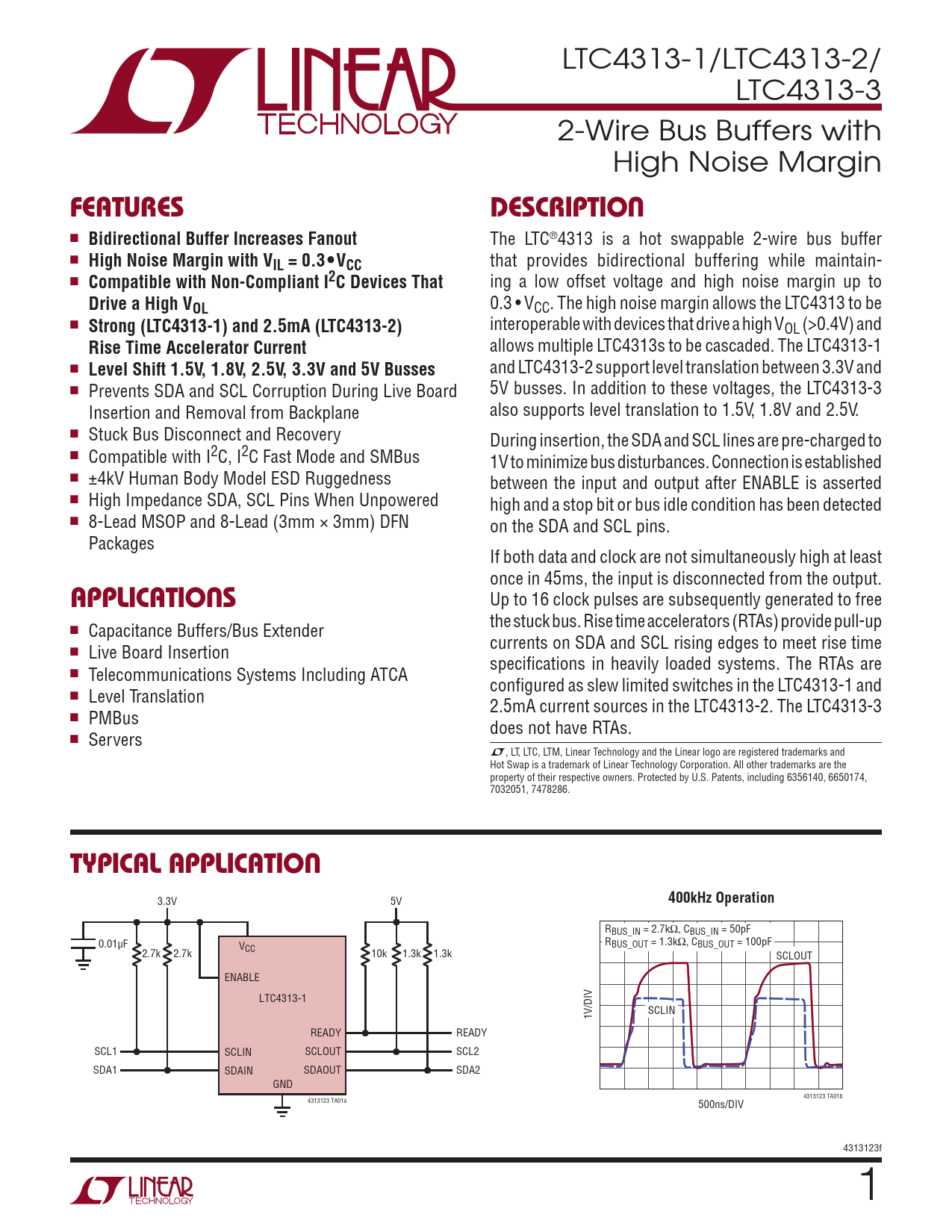 LTC4313-1/LTC4313-2/ LTC4313-3 2-Wire Bus Buffers with High Noise Margin FeaTuresDescripTion n Bidirectional Buffer Increases Fanout The LTC®4313 is a hot swappable 2-wire bus buffer n High Noise Margin with VIL = 0.3•VCC that provides bidirectional buffering while maintain- n Compatible with Non-Compliant I2C Devices That ing a low offset voltage and high noise margin up to Drive a High V 0.3 • V OL CC. The high noise margin allows the LTC4313 to be n Strong (LTC4313-1) and 2.5mA (LTC4313-2) interoperable with devices that drive a high VOL (>0.4V) and Rise Time Accelerator Current allows multiple LTC4313s to be cascaded. The LTC4313-1 n Level Shift 1.5V, 1.8V, 2.5V, 3.3V and 5V Busses and LTC4313-2 support level translation between 3.3V and n Prevents SDA and SCL Corruption During Live Board 5V busses. In addition to these voltages, the LTC4313-3 Insertion and Removal from Backplane also supports level translation to 1.5V, 1.8V and 2.5V. n Stuck Bus Disconnect and Recovery During insertion, the SDA and SCL lines are pre-charged to n Compatible with I2C, I2C Fast Mode and SMBus 1V to minimize bus disturbances. Connection is established n ±4kV Human Body Model ESD Ruggedness between the input and output after ENABLE is asserted n High Impedance SDA, SCL Pins When Unpowered high and a stop bit or bus idle condition has been detected n 8-Lead MSOP and 8-Lead (3mm × 3mm) DFN on the SDA and SCL pins. Packages If both data and clock are not simultaneously high at least once in 45ms, the input is disconnected from the output. applicaTions Up to 16 clock pulses are subsequently generated to free the stuck bus. Rise time accelerators (RTAs) provide pull-up n Capacitance Buffers/Bus Extender currents on SDA and SCL rising edges to meet rise time n Live Board Insertion specifications in heavily loaded systems. The RTAs are n Telecommunications Systems Including ATCA configured as slew limited switches in the LTC4313-1 and n Level Translation 2.5mA current sources in the LTC4313-2. The LTC4313-3 n PMBus does not have RTAs. n Servers L, LT, LTC, LTM, Linear Technology and the Linear logo are registered trademarks and Hot Swap is a trademark of Linear Technology Corporation. All other trademarks are the property of their respective owners. Protected by U.S. Patents, including 6356140, 6650174, 7032051, 7478286. Typical applicaTion 3.3V 5V 400kHz Operation RBUS_IN = 2.7kΩ, CBUS_IN = 50pF 0.01µF V R CC BUS_OUT = 1.3kΩ, CBUS_OUT = 100pF 2.7k 2.7k 10k 1.3k 1.3k SCLOUT ENABLE LTC4313-1 1V/DIV SCLIN READY READY SCL1 SCLIN SCLOUT SCL2 SDA1 SDAIN SDAOUT SDA2 GND 4313123 TA01b 4313123 TA01a 500ns/DIV 4313123f 1 Document Outline Features Applications Description Typical Application Absolute Maximum Ratings Pin Configuration Order Information Electrical Characteristics Typical Performance Characteristics Pin Functions Block Diagram Operation Applications Information Package Description Typical Application Related Parts