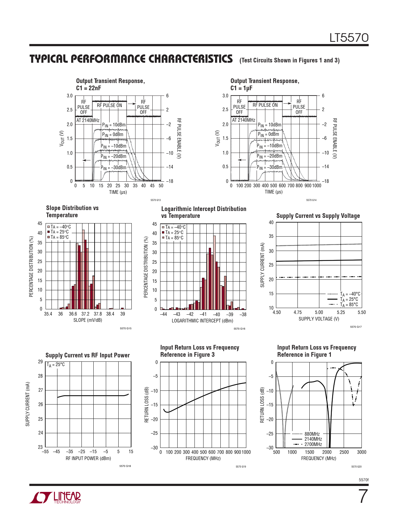 29 0 0 TA = 25°C 28 –5 –5 27 –10 –10 26 –15 –15 Y CURRENT (mA) 25 RETURN LOSS (dB) –20 RETURN LOSS (dB) –20 SUPPL 24 –25 –25 880MHz 2140MHz 2700MHz 23 –30 –30 –55 –45 –35 –25 –15 –5 5 15 0 100 200 300 400 500 600 700 800 900 1000 500 1000 1500 2000 2500 3000 RF INPUT POWER (dBm) FREQUENCY (MHz) FREQUENCY (MHz) 5570 G18 5570 G19 5570 G20 5570f 7
