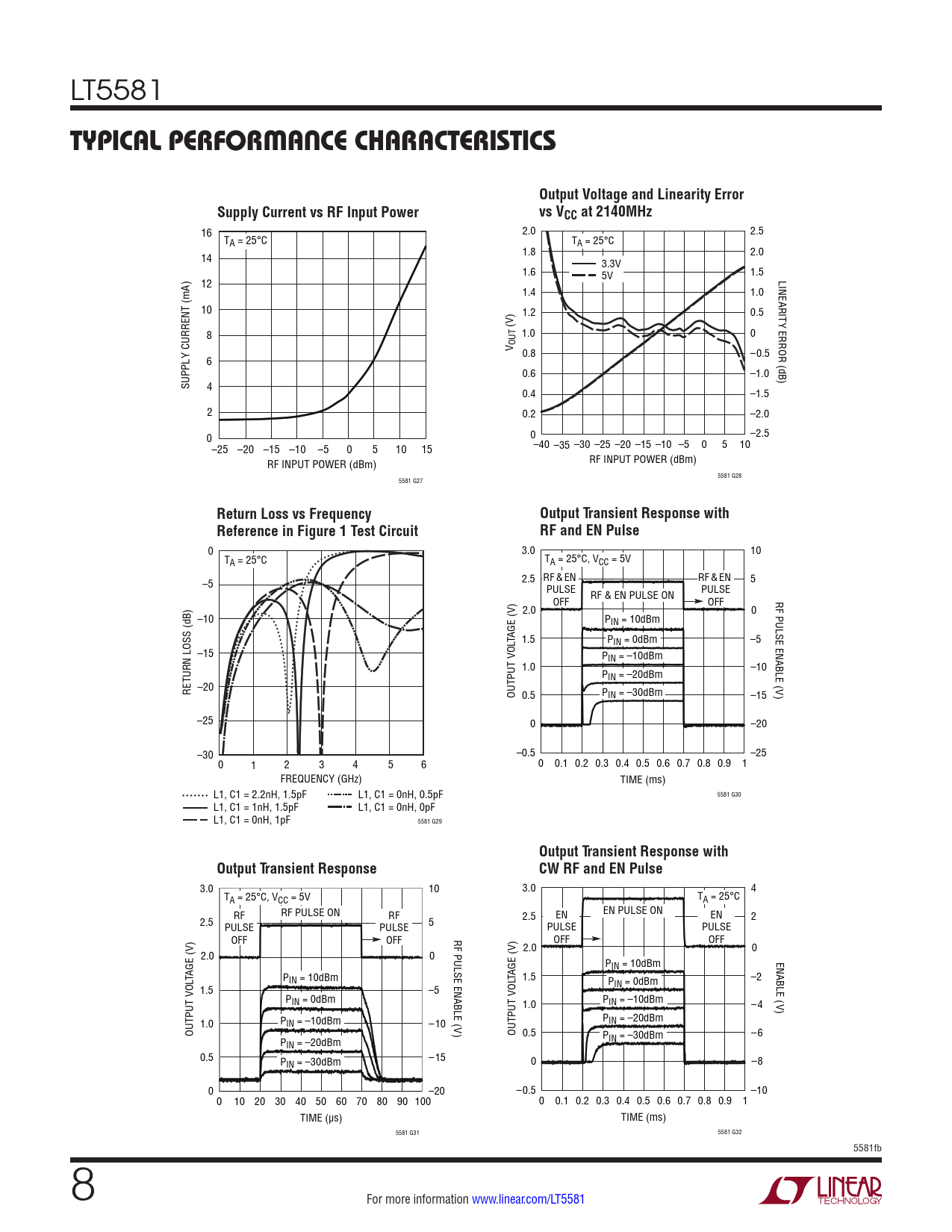 0 3.0 10 TA = 25°C TA = 25°C, VCC = 5V RF & EN RF & EN –5 2.5 5 PULSE RF & EN PULSE ON PULSE RF PULSE ENABLE ( OFF OFF 2.0 0 –10 PIN = 10dBm TAGE (V) 1.5 PIN = 0dBm –5 –15 PIN = –10dBm 1.0 –10 PIN = –20dBm RETURN LOSS (dB) –20 V OUTPUT VOL 0.5 PIN = –30dBm –15 ) –25 0 –20 –30 –0.5 –25 0 1 2 3 4 5 6 0 0.1 0.2 0.3 0.4 0.5 0.6 0.7 0.8 0.9 1 FREQUENCY (GHz) TIME (ms) L1, C1 = 2.2nH, 1.5pF L1, C1 = 0nH, 0.5pF 5581 G30 L1, C1 = 1nH, 1.5pF L1, C1 = 0nH, 0pF L1, C1 = 0nH, 1pF 5581 G29
