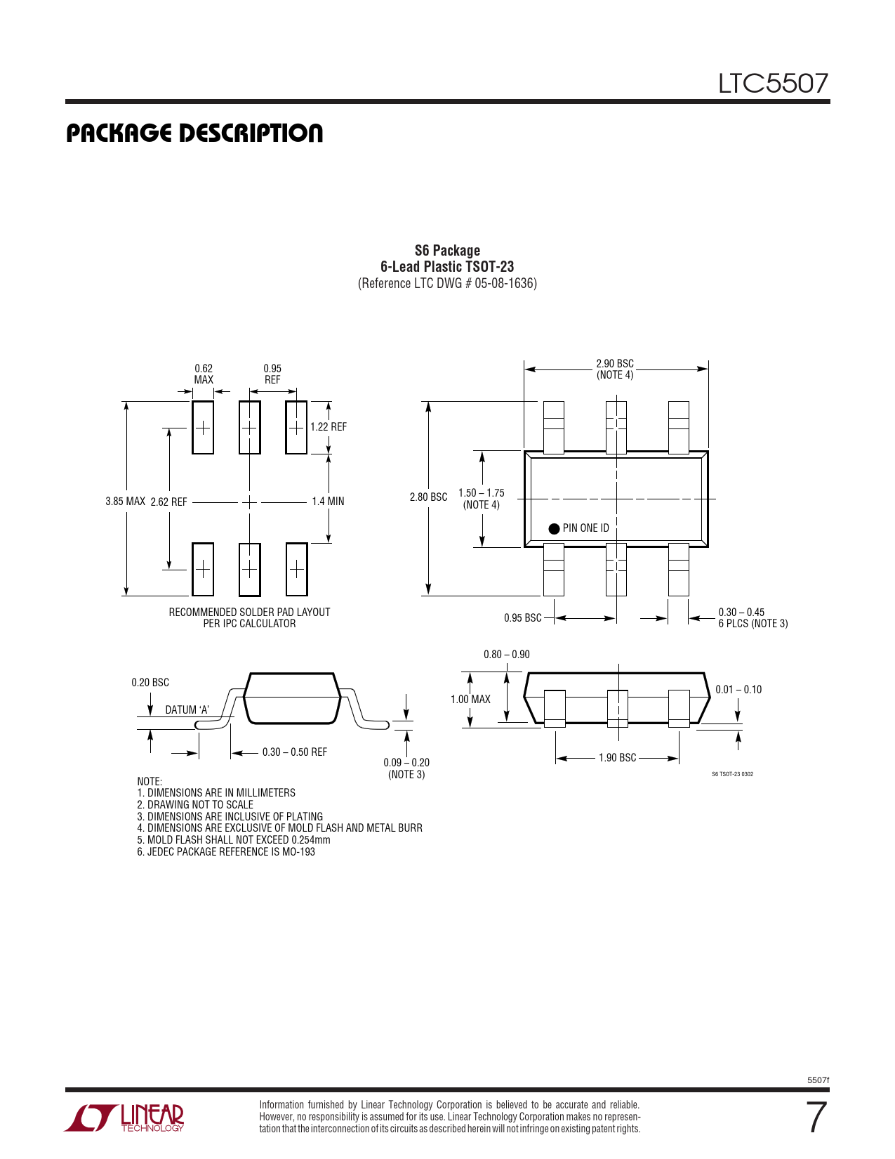 (Reference LTC DWG # 05-08-1636) 2.90 BSC 0.62 0.95 (NOTE 4) MAX REF 1.22 REF 1.50 – 1.75 2.80 BSC 3.85 MAX 2.62 REF 1.4 MIN (NOTE 4) PIN ONE ID RECOMMENDED SOLDER PAD LAYOUT 0.30 – 0.45 0.95 BSC PER IPC CALCULATOR 6 PLCS (NOTE 3) 0.80 – 0.90 0.20 BSC 0.01 – 0.10 1.00 MAX DATUM ‘A’ 0.30 – 0.50 REF 0.09 – 0.20 1.90 BSC (NOTE 3) S6 TSOT-23 0302 NOTE: 1. DIMENSIONS ARE IN MILLIMETERS 2. DRAWING NOT TO SCALE 3. DIMENSIONS ARE INCLUSIVE OF PLATING 4. DIMENSIONS ARE EXCLUSIVE OF MOLD FLASH AND METAL BURR 5. MOLD FLASH SHALL NOT EXCEED 0.254mm 6. JEDEC PACKAGE REFERENCE IS MO-193 5507f Information furnished by Linear Technology Corporation is believed to be accurate and reliable. However, no responsibility is assumed for its use. Linear Technology Corporation makes no represen- tation that the interconnection of its circuits as described herein will not infringe on existing patent rights. 7