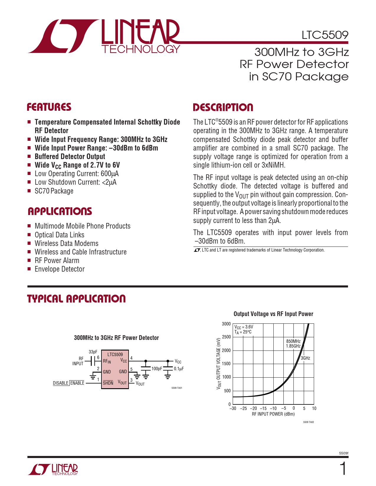 LTC5509 300MHz to 3GHz RF Power Detector in SC70 Package UFEATURESDESCRIPTIO ■ Temperature Compensated Internal Schottky Diode The LTC®5509 is an RF power detector for RF applications RF Detector operating in the 300MHz to 3GHz range. A temperature ■ Wide Input Frequency Range: 300MHz to 3GHz compensated Schottky diode peak detector and buffer ■ Wide Input Power Range: –30dBm to 6dBm amplifier are combined in a small SC70 package. The ■ Buffered Detector Output supply voltage range is optimized for operation from a ■ Wide VCC Range of 2.7V to 6V single lithium-ion cell or 3xNiMH. ■ Low Operating Current: 600µA The RF input voltage is peak detected using an on-chip ■ Low Shutdown Current: <2µA Schottky diode. The detected voltage is buffered and ■ SC70 Package supplied to the VOUT pin without gain compression. Con- sequently, the output voltage is linearly proportional to the UAPPLICATIO S RF input voltage. A power saving shutdown mode reduces supply current to less than 2µA. ■ Multimode Mobile Phone Products ■ Optical Data Links The LTC5509 operates with input power levels from ■ Wireless Data Modems –30dBm to 6dBm. ■ Wireless and Cable Infrastructure , LTC and LT are registered trademarks of Linear Technology Corporation. ■ RF Power Alarm ■ Envelope Detector UTYPICAL APPLICATIOOutput Voltage vs RF Input Power 3000 VCC = 3.6V TA = 25°C 300MHz to 3GHz RF Power Detector 2500 850MHz 1.85GHz 33pF 2000 LTC5509 6 RF 4 V 3GHz RF CC V IN CC INPUT 1500 2 5 100pF 0.1µF GND GND 1000 1 3 OUTPUT VOLTAGE (mV) V DISABLE ENABLE SHDN OUT VOUT OUT 5509 TA01 V 500 0 –30 –25 –20 –15 –10 –5 0 5 10 RF INPUT POWER (dBm) 5509 TA02 5509f 1