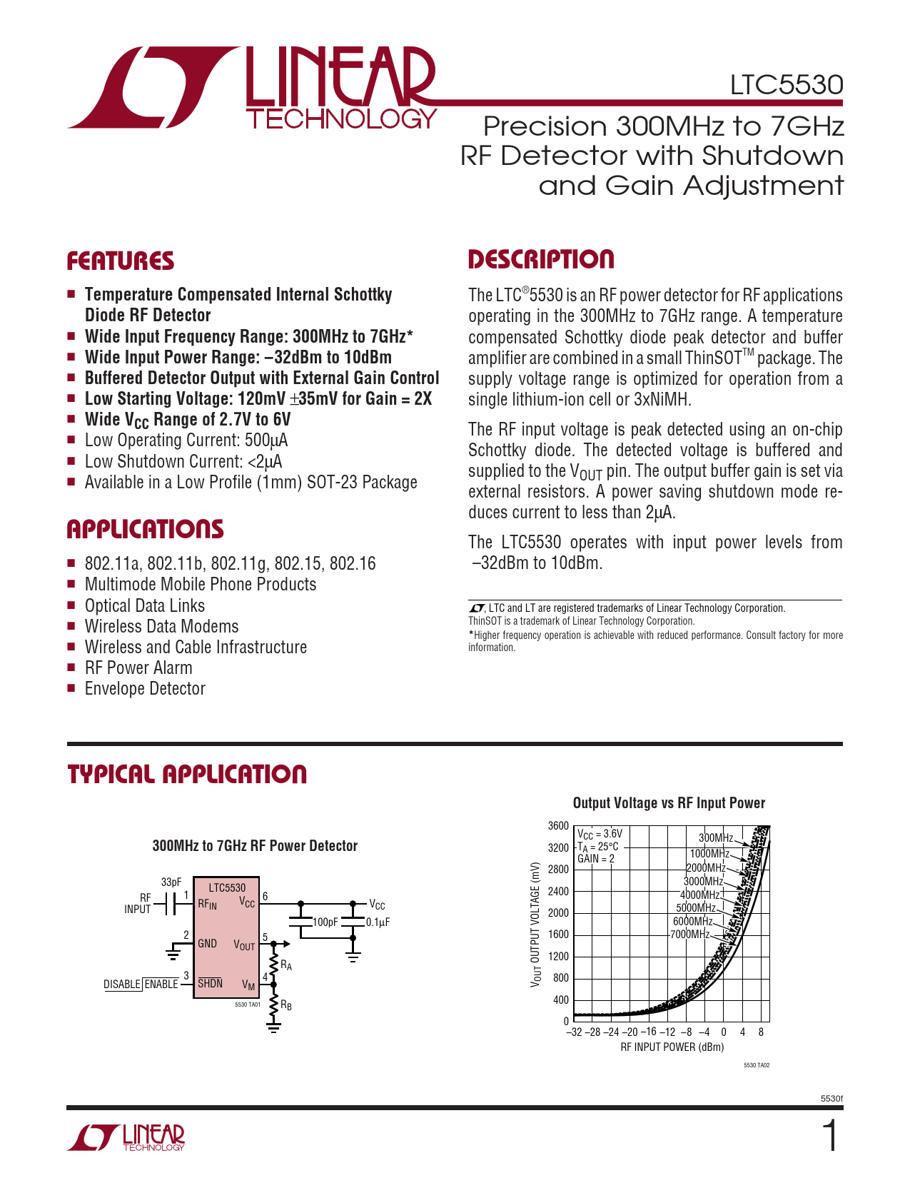 LTC5530 Precision 300MHz to 7GHz RF Detector with Shutdown and Gain Adjustment UFEATURESDESCRIPTIO ■ Temperature Compensated Internal Schottky The LTC®5530 is an RF power detector for RF applications Diode RF Detector operating in the 300MHz to 7GHz range. A temperature ■ Wide Input Frequency Range: 300MHz to 7GHz* compensated Schottky diode peak detector and buffer ■ Wide Input Power Range: –32dBm to 10dBm amplifier are combined in a small ThinSOTTM package. The ■ Buffered Detector Output with External Gain Control supply voltage range is optimized for operation from a ■ Low Starting Voltage: 120mV ± 35mV for Gain = 2X single lithium-ion cell or 3xNiMH. ■ Wide VCC Range of 2.7V to 6V The RF input voltage is peak detected using an on-chip ■ Low Operating Current: 500µA Schottky diode. The detected voltage is buffered and ■ Low Shutdown Current: <2µA supplied to the V ■ Available in a Low Profile (1mm) SOT-23 Package OUT pin. The output buffer gain is set via external resistors. A power saving shutdown mode re- U duces current to less than 2µA. APPLICATIO S The LTC5530 operates with input power levels from ■ 802.11a, 802.11b, 802.11g, 802.15, 802.16 –32dBm to 10dBm. ■ Multimode Mobile Phone Products ■ Optical Data Links , LTC and LT are registered trademarks of Linear Technology Corporation. ■ Wireless Data Modems ThinSOT is a trademark of Linear Technology Corporation. * Higher frequency operation is achievable with reduced performance. Consult factory for more ■ Wireless and Cable Infrastructure information. ■ RF Power Alarm ■ Envelope Detector UTYPICAL APPLICATIOOutput Voltage vs RF Input Power 3600 VCC = 3.6V 300MHz 300MHz to 7GHz RF Power Detector 3200 TA = 25°C 1000MHz GAIN = 2 2800 2000MHz 33pF 3000MHz LTC5530 1 2400 RF 6 4000MHz V RF CC V IN CC INPUT 5000MHz 2000 100pF 0.1µF 6000MHz 2 5 1600 7000MHz GND VOUT 1200 R OUTPUT VOLTAGE (mV) A 3 4 OUT 800 DISABLE ENABLE SHDN VM V 400 5530 TA01 RB 0 –32 –28 –24 –20 –16 –12 –8 –4 0 4 8 RF INPUT POWER (dBm) 5530 TA02 5530f 1