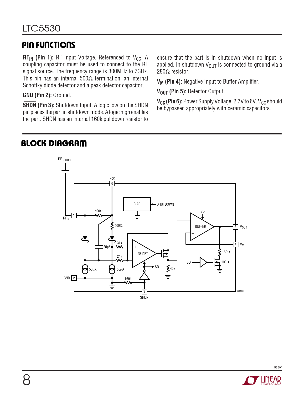 LTC5530 UUUPI FU CTIO SRFIN (Pin 1): RF Input Voltage. Referenced to VCC. A ensure that the part is in shutdown when no input is coupling capacitor must be used to connect to the RF applied. In shutdown VOUT is connected to ground via a signal source. The frequency range is 300MHz to 7GHz. 280Ω resistor. This pin has an internal 500Ω termination, an internal V Schottky diode detector and a peak detector capacitor. M (Pin 4): Negative Input to Buffer Amplifier. VGND (Pin 2): Ground. OUT (Pin 5): Detector Output. VSHDN (Pin 3): Shutdown Input. A logic low on the SHDN CC (Pin 6): Power Supply Voltage, 2.7V to 6V. VCC should be bypassed appropriately with ceramic capacitors. pin places the part in shutdown mode. A logic high enables the part. SHDN has an internal 160k pulldown resistor to WBLOCK DIAGRA RFSOURCE VCC 6 BIAS SHUTDOWN 500Ω SD 1 RFIN + 500Ω BUFFER 5 VOUT – 31k 4 VM 25pF + RF DET 180Ω 24k – SD 100Ω SD 50µA 50µA 40k GND 2 160k 5530 BD 3 SHDN 5530f 8