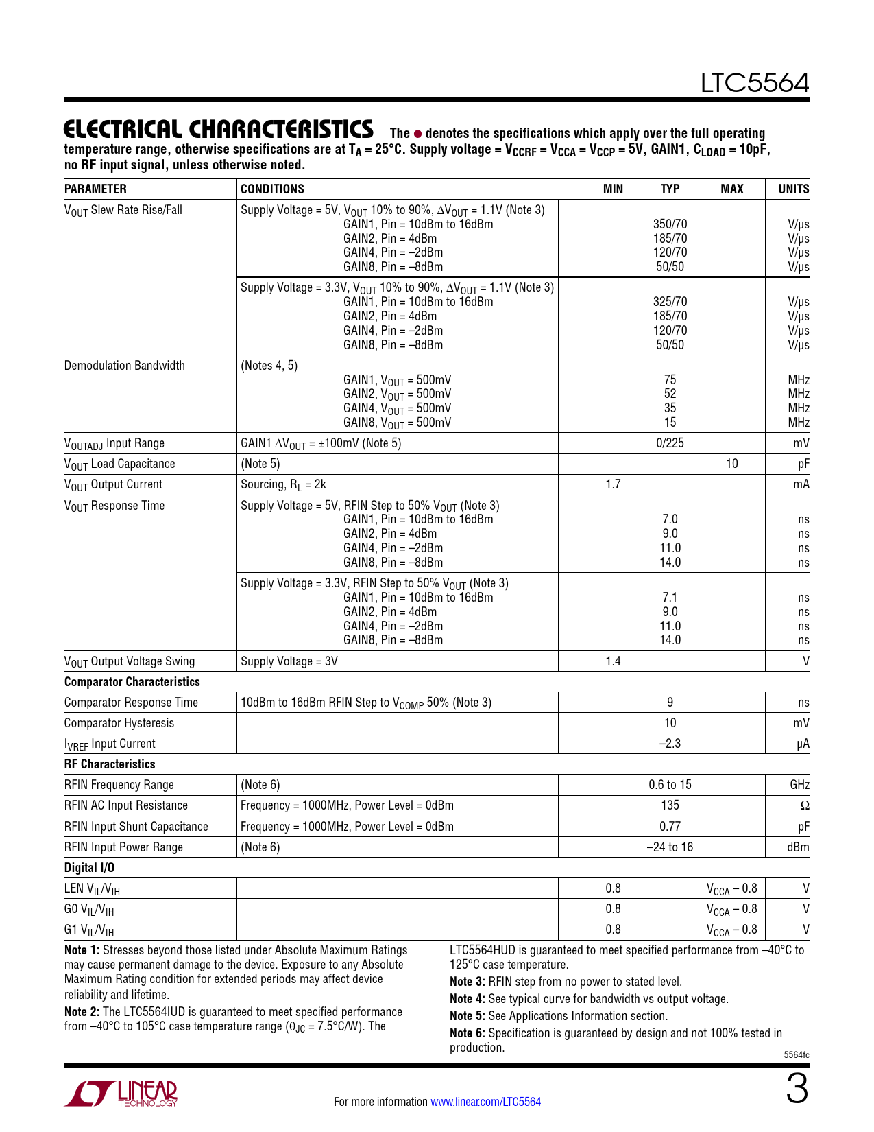 LTC5564 ELECTRICALCHARACTERISTICS The l denotes the specifications which apply over the full operatingtemperature range, otherwise specifications are at TA = 25°C. Supply voltage = VCCRF = VCCA = VCCP = 5V, GAIN1, CLOAD = 10pF,no RF input signal, unless otherwise noted. PARAMETERCONDITIONSMINTYPMAXUNITS VOUT Slew Rate Rise/Fall Supply Voltage = 5V, VOUT 10% to 90%, ∆VOUT = 1.1V (Note 3) GAIN1, Pin = 10dBm to 16dBm 350/70 V/µs GAIN2, Pin = 4dBm 185/70 V/µs GAIN4, Pin = –2dBm 120/70 V/µs GAIN8, Pin = –8dBm 50/50 V/µs Supply Voltage = 3.3V, VOUT 10% to 90%, ∆VOUT = 1.1V (Note 3) GAIN1, Pin = 10dBm to 16dBm 325/70 V/µs GAIN2, Pin = 4dBm 185/70 V/µs GAIN4, Pin = –2dBm 120/70 V/µs GAIN8, Pin = –8dBm 50/50 V/µs Demodulation Bandwidth (Notes 4, 5) GAIN1, VOUT = 500mV 75 MHz GAIN2, VOUT = 500mV 52 MHz GAIN4, VOUT = 500mV 35 MHz GAIN8, VOUT = 500mV 15 MHz VOUTADJ Input Range GAIN1 ∆VOUT = ±100mV (Note 5) 0/225 mV VOUT Load Capacitance (Note 5) 10 pF VOUT Output Current Sourcing, RL = 2k 1.7 mA VOUT Response Time Supply Voltage = 5V, RFIN Step to 50% VOUT (Note 3) GAIN1, Pin = 10dBm to 16dBm 7.0 ns GAIN2, Pin = 4dBm 9.0 ns GAIN4, Pin = –2dBm 11.0 ns GAIN8, Pin = –8dBm 14.0 ns Supply Voltage = 3.3V, RFIN Step to 50% VOUT (Note 3) GAIN1, Pin = 10dBm to 16dBm 7.1 ns GAIN2, Pin = 4dBm 9.0 ns GAIN4, Pin = –2dBm 11.0 ns GAIN8, Pin = –8dBm 14.0 ns VOUT Output Voltage Swing Supply Voltage = 3V 1.4 V Comparator Characteristics Comparator Response Time 10dBm to 16dBm RFIN Step to VCOMP 50% (Note 3) 9 ns Comparator Hysteresis 10 mV IVREF Input Current –2.3 µA RFCharacteristics RFIN Frequency Range (Note 6) 0.6 to 15 GHz RFIN AC Input Resistance Frequency = 1000MHz, Power Level = 0dBm 135 Ω RFIN Input Shunt Capacitance Frequency = 1000MHz, Power Level = 0dBm 0.77 pF RFIN Input Power Range (Note 6) –24 to 16 dBm Digital I/O LEN VIL/VIH 0.8 VCCA – 0.8 V G0 VIL/VIH 0.8 VCCA – 0.8 V G1 VIL/VIH 0.8 VCCA – 0.8 V Note 1: Stresses beyond those listed under Absolute Maximum Ratings LTC5564HUD is guaranteed to meet specified performance from –40°C to may cause permanent damage to the device. Exposure to any Absolute 125°C case temperature. Maximum Rating condition for extended periods may affect device Note 3: RFIN step from no power to stated level. reliability and lifetime. Note 4: See typical curve for bandwidth vs output voltage. Note 2: The LTC5564IUD is guaranteed to meet specified performance Note 5: See Applications Information section. from –40°C to 105°C case temperature range (θJC = 7.5°C/W). The Note 6: Specification is guaranteed by design and not 100% tested in production. 5564fc For more information www.linear.com/LTC5564 3 Document Outline Features Description Applications Typical Application Absolute Maximum Ratings Pin Configuration Order Information Electrical Characteristics Typical Performance Characteristics Pin Functions Simplified Block Diagram Applications Information Revision History Typical Application Related Parts