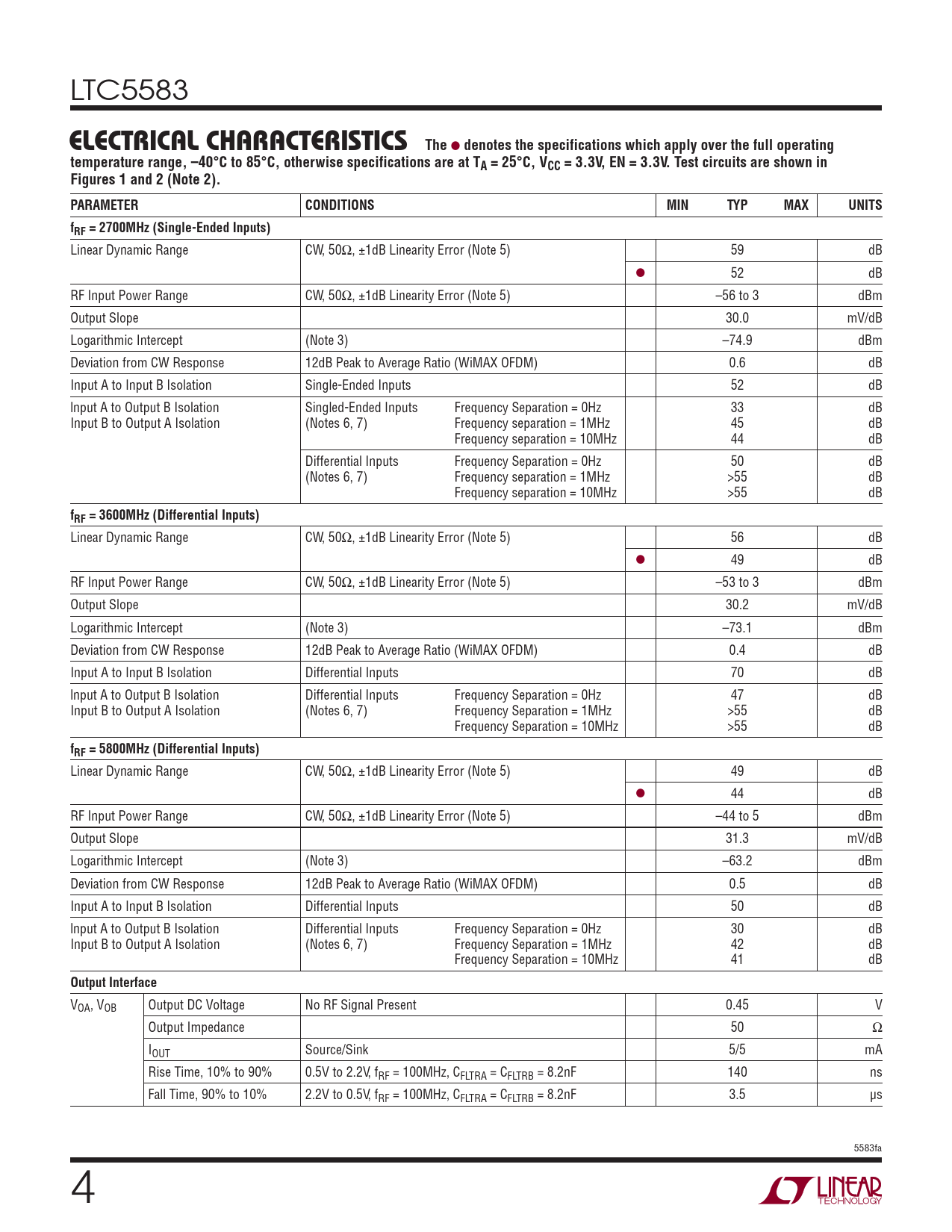 Linear Dynamic Range CW, 50Ω, ±1dB Linearity Error (Note 5) 59 dB l 52 dB RF Input Power Range CW, 50Ω, ±1dB Linearity Error (Note 5) –56 to 3 dBm Output Slope 30.0 mV/dB Logarithmic Intercept (Note 3) –74.9 dBm Deviation from CW Response 12dB Peak to Average Ratio (WiMAX OFDM) 0.6 dB Input A to Input B Isolation Single-Ended Inputs 52 dB lnput A to Output B Isolation Singled-Ended Inputs Frequency Separation = 0Hz 33 dB Input B to Output A Isolation (Notes 6, 7) Frequency separation = 1MHz 45 dB Frequency separation = 10MHz 44 dB Differential Inputs Frequency Separation = 0Hz 50 dB (Notes 6, 7) Frequency separation = 1MHz >55 dB Frequency separation = 10MHz >55 dB