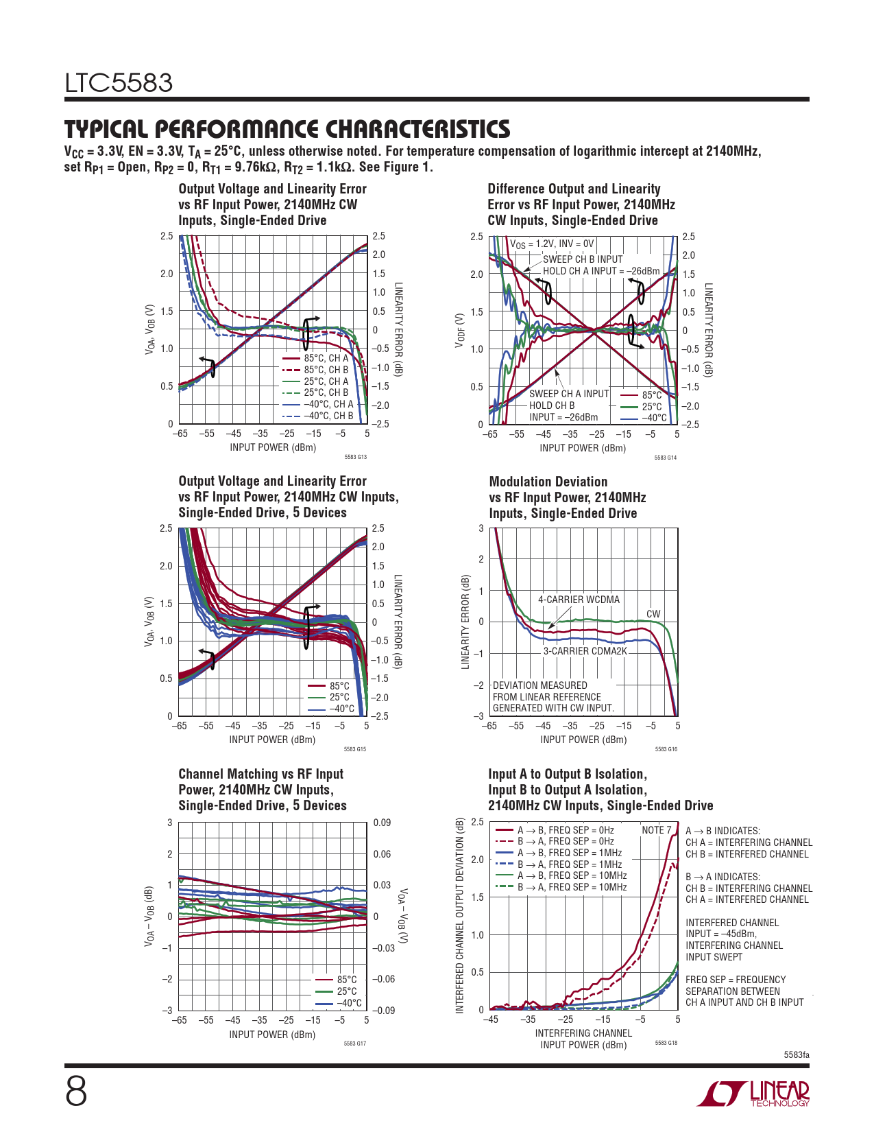2.5 2.5 2.5 2.5 VOS = 1.2V, INV = 0V 2.0 2.0 SWEEP CH B INPUT 2.0 1.5 HOLD CH A INPUT = –26dBm LINEARITY ERROR (dB) 2.0 1.5 LINEARITY ERROR (dB) 1.0 1.0 (V) 1.5 0.5 1.5 0.5 OB (V) 0 0 , V ODF OA V V 1.0 –0.5 1.0 –0.5 85°C, CH A –1.0 85°C, CH B –1.0 25°C, CH A 0.5 –1.5 0.5 –1.5 25°C, CH B SWEEP CH A INPUT 85°C –40°C, CH A –2.0 HOLD CH B 25°C –2.0 –40°C, CH B INPUT = –26dBm –40°C 0 –2.5 0 –2.5 –65 –55 –45 –35 –25 –15 –5 5 –65 –55 –45 –35 –25 –15 –5 5 INPUT POWER (dBm) INPUT POWER (dBm) 5583 G13 5583 G14