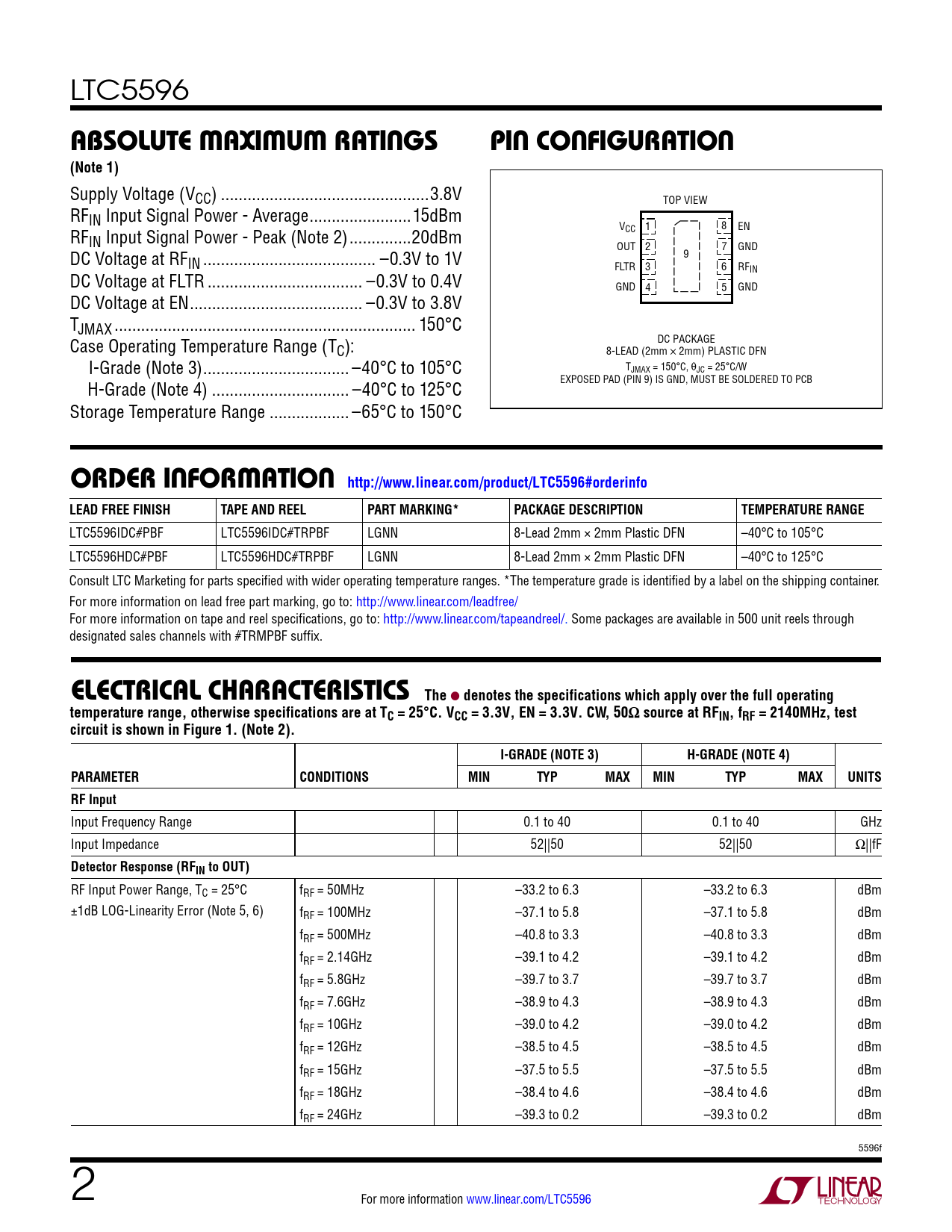 LTC5596 absoluTe MaxiMuM raTingspin conFiguraTion(Note 1) Supply Voltage (VCC) ...3.8V TOP VIEW RFIN Input Signal Power - Average ...15dBm VCC 1 8 EN RFIN Input Signal Power - Peak (Note 2) ..20dBm OUT 2 7 GND 9 DC Voltage at RFIN ... –0.3V to 1V FLTR 3 6 RFIN DC Voltage at FLTR ... –0.3V to 0.4V GND 4 5 GND DC Voltage at EN ... –0.3V to 3.8V TJMAX .. 150°C DC PACKAGE Case Operating Temperature Range (TC): 8-LEAD (2mm × 2mm) PLASTIC DFN T I-Grade (Note 3) ... –40°C to 105°C JMAX = 150°C, θJC = 25°C/W EXPOSED PAD (PIN 9) IS GND, MUST BE SOLDERED TO PCB H-Grade (Note 4) ... –40°C to 125°C Storage Temperature Range .. –65°C to 150°C orDer inForMaTion http://www.linear.com/product/LTC5596#orderinfoLEAD FREE FINISHTAPE AND REELPART MARKING*PACKAGE DESCRIPTIONTEMPERATURE RANGE LTC5596IDC#PBF LTC5596IDC#TRPBF LGNN 8-Lead 2mm × 2mm Plastic DFN –40°C to 105°C LTC5596HDC#PBF LTC5596HDC#TRPBF LGNN 8-Lead 2mm × 2mm Plastic DFN –40°C to 125°C Consult LTC Marketing for parts specified with wider operating temperature ranges. *The temperature grade is identified by a label on the shipping container. For more information on lead free part marking, go to: http://www.linear.com/leadfree/ For more information on tape and reel specifications, go to: http://www.linear.com/tapeandreel/. Some packages are available in 500 unit reels through designated sales channels with #TRMPBF suffix. elecTrical characTerisTicsThe l denotes the specifications which apply over the full operatingtemperature range, otherwise specifications are at TC = 25°C. VCC = 3.3V, EN = 3.3V. CW, 50Ω source at RFIN, fRF = 2140MHz, testcircuit is shown in Figure 1. (Note 2).I-GRADE (NOTE 3)H-GRADE (NOTE 4)PARAMETERCONDITIONSMINTYPMAXMINTYPMAXUNITSRF Input Input Frequency Range 0.1 to 40 0.1 to 40 GHz Input Impedance 52||50 52||50 Ω||fF Detector Response (RFIN to OUT) RF Input Power Range, TC = 25°C fRF = 50MHz –33.2 to 6.3 –33.2 to 6.3 dBm ±1dB LOG-Linearity Error (Note 5, 6) fRF = 100MHz –37.1 to 5.8 –37.1 to 5.8 dBm fRF = 500MHz –40.8 to 3.3 –40.8 to 3.3 dBm fRF = 2.14GHz –39.1 to 4.2 –39.1 to 4.2 dBm fRF = 5.8GHz –39.7 to 3.7 –39.7 to 3.7 dBm fRF = 7.6GHz –38.9 to 4.3 –38.9 to 4.3 dBm fRF = 10GHz –39.0 to 4.2 –39.0 to 4.2 dBm fRF = 12GHz –38.5 to 4.5 –38.5 to 4.5 dBm fRF = 15GHz –37.5 to 5.5 –37.5 to 5.5 dBm fRF = 18GHz –38.4 to 4.6 –38.4 to 4.6 dBm fRF = 24GHz –39.3 to 0.2 –39.3 to 0.2 dBm 5596f 2 For more information www.linear.com/LTC5596 Document Outline Features Description Applications Typical Application Absolute Maximum Ratings Pin Configuration Order Information Electrical Characteristics Typical Performance Characteristics Pin Functions Test Circuit Applications Information Package Description Typical Application Related Parts