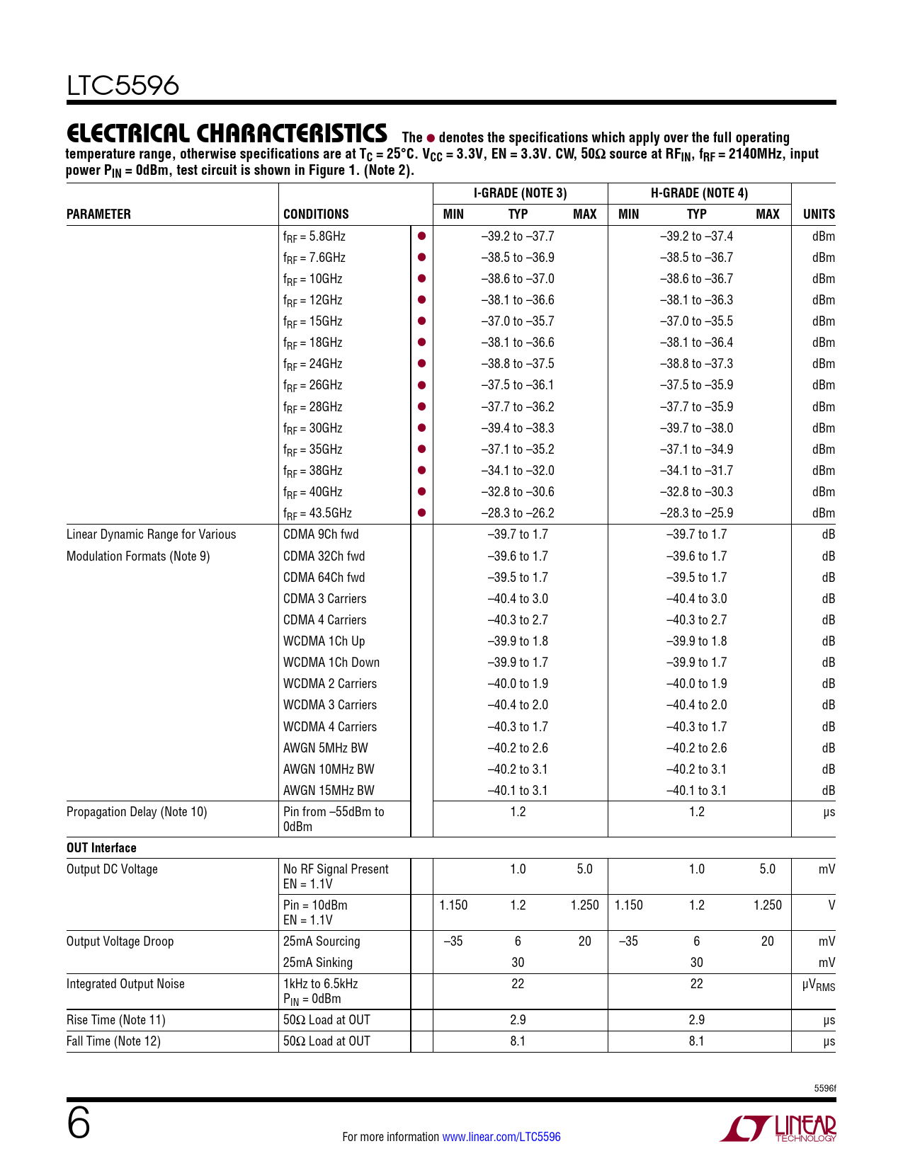 LTC5596 elecTrical characTerisTicsThe l denotes the specifications which apply over the full operatingtemperature range, otherwise specifications are at TC = 25°C. VCC = 3.3V, EN = 3.3V. CW, 50Ω source at RFIN, fRF = 2140MHz, inputpower PIN = 0dBm, test circuit is shown in Figure 1. (Note 2).I-GRADE (NOTE 3)H-GRADE (NOTE 4)PARAMETERCONDITIONSMINTYPMAXMINTYPMAXUNITS fRF = 5.8GHz l –39.2 to –37.7 –39.2 to –37.4 dBm fRF = 7.6GHz l –38.5 to –36.9 –38.5 to –36.7 dBm fRF = 10GHz l –38.6 to –37.0 –38.6 to –36.7 dBm fRF = 12GHz l –38.1 to –36.6 –38.1 to –36.3 dBm fRF = 15GHz l –37.0 to –35.7 –37.0 to –35.5 dBm fRF = 18GHz l –38.1 to –36.6 –38.1 to –36.4 dBm fRF = 24GHz l –38.8 to –37.5 –38.8 to –37.3 dBm fRF = 26GHz l –37.5 to –36.1 –37.5 to –35.9 dBm fRF = 28GHz l –37.7 to –36.2 –37.7 to –35.9 dBm fRF = 30GHz l –39.4 to –38.3 –39.7 to –38.0 dBm fRF = 35GHz l –37.1 to –35.2 –37.1 to –34.9 dBm fRF = 38GHz l –34.1 to –32.0 –34.1 to –31.7 dBm fRF = 40GHz l –32.8 to –30.6 –32.8 to –30.3 dBm fRF = 43.5GHz l –28.3 to –26.2 –28.3 to –25.9 dBm Linear Dynamic Range for Various CDMA 9Ch fwd –39.7 to 1.7 –39.7 to 1.7 dB Modulation Formats (Note 9) CDMA 32Ch fwd –39.6 to 1.7 –39.6 to 1.7 dB CDMA 64Ch fwd –39.5 to 1.7 –39.5 to 1.7 dB CDMA 3 Carriers –40.4 to 3.0 –40.4 to 3.0 dB CDMA 4 Carriers –40.3 to 2.7 –40.3 to 2.7 dB WCDMA 1Ch Up –39.9 to 1.8 –39.9 to 1.8 dB WCDMA 1Ch Down –39.9 to 1.7 –39.9 to 1.7 dB WCDMA 2 Carriers –40.0 to 1.9 –40.0 to 1.9 dB WCDMA 3 Carriers –40.4 to 2.0 –40.4 to 2.0 dB WCDMA 4 Carriers –40.3 to 1.7 –40.3 to 1.7 dB AWGN 5MHz BW –40.2 to 2.6 –40.2 to 2.6 dB AWGN 10MHz BW –40.2 to 3.1 –40.2 to 3.1 dB AWGN 15MHz BW –40.1 to 3.1 –40.1 to 3.1 dB Propagation Delay (Note 10) Pin from –55dBm to 1.2 1.2 μs 0dBm OUT Interface Output DC Voltage No RF Signal Present 1.0 5.0 1.0 5.0 mV EN = 1.1V Pin = 10dBm 1.150 1.2 1.250 1.150 1.2 1.250 V EN = 1.1V Output Voltage Droop 25mA Sourcing –35 6 20 –35 6 20 mV 25mA Sinking 30 30 mV Integrated Output Noise 1kHz to 6.5kHz 22 22 μVRMS PIN = 0dBm Rise Time (Note 11) 50Ω Load at OUT 2.9 2.9 μs Fall Time (Note 12) 50Ω Load at OUT 8.1 8.1 μs 5596f 6 For more information www.linear.com/LTC5596 Document Outline Features Description Applications Typical Application Absolute Maximum Ratings Pin Configuration Order Information Electrical Characteristics Typical Performance Characteristics Pin Functions Test Circuit Applications Information Package Description Typical Application Related Parts