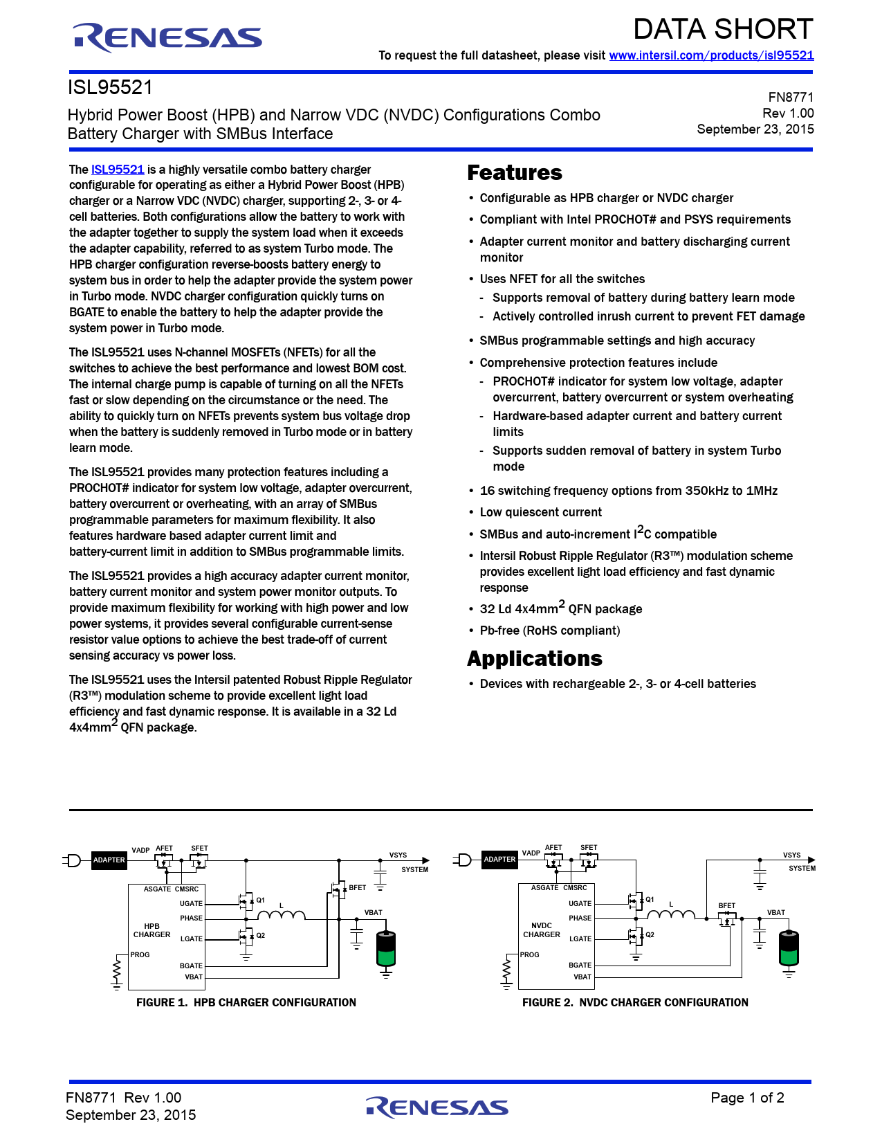 FIGURE 1. HPB CHARGER CONFIGURATION FIGURE 2. NVDC CHARGER CONFIGURATION FN8771 Rev 1.00 Page 1 of 2 September 23, 2015