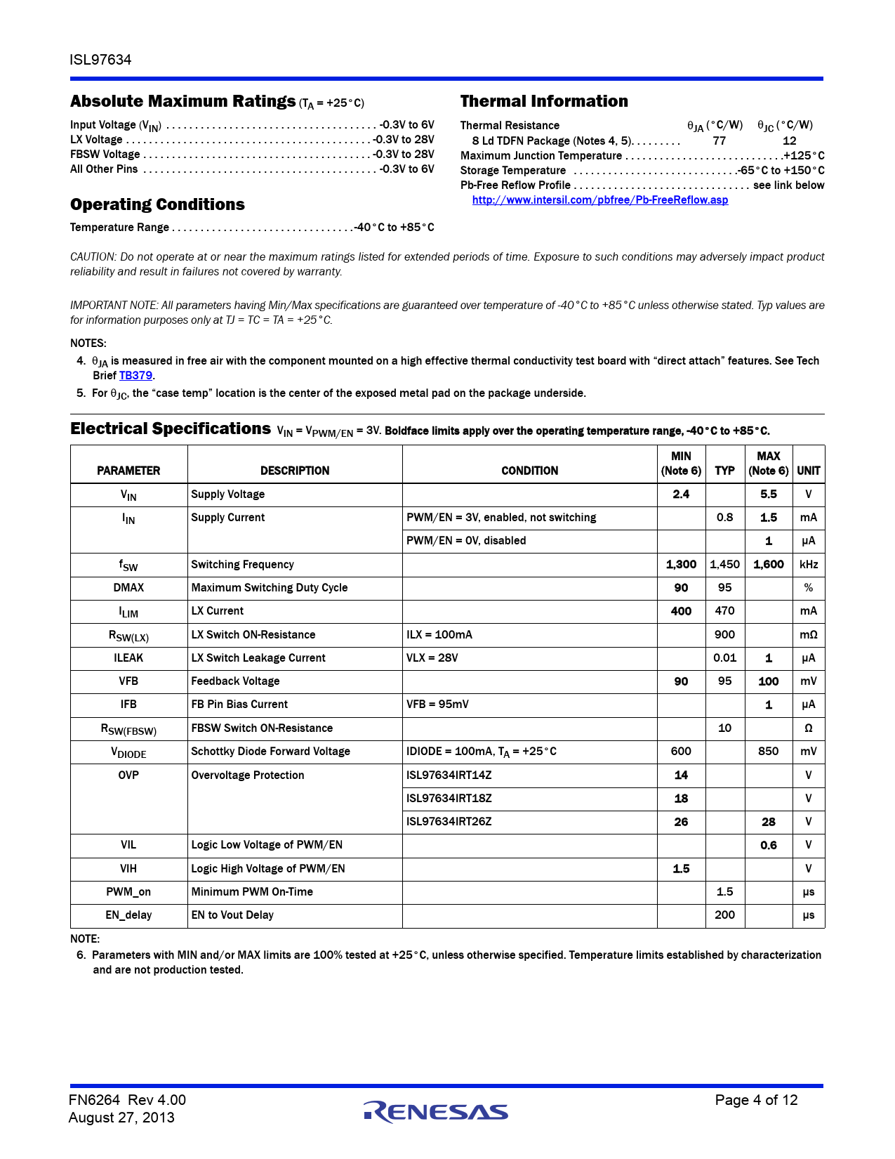 link to page 4 link to page 4 link to page 4 link to page 4 ISL97634 Absolute Maximum Ratings (TA = +25°C) Thermal Information Input Voltage (VIN) . -0.3V to 6V Thermal Resistance JA (°C/W) JC (°C/W) LX Voltage . -0.3V to 28V 8 Ld TDFN Package (Notes 4, 5). 77 12 FBSW Voltage . -0.3V to 28V Maximum Junction Temperature . .+125°C All Other Pins . -0.3V to 6V Storage Temperature . .-65°C to +150°C Pb-Free Reflow Profile . see link below Operating Conditions http://www.intersil.com/pbfree/Pb-FreeReflow.asp Temperature Range . -40°C to +85°C CAUTION: Do not operate at or near the maximum ratings listed for extended periods of time. Exposure to such conditions may adversely impact product reliability and result in failures not covered by warranty. IMPORTANT NOTE: All parameters having Min/Max specifications are guaranteed over temperature of -40°C to +85°C unless otherwise stated. Typ values are for information purposes only at TJ = TC = TA = +25°C. NOTES: 4. JA is measured in free air with the component mounted on a high effective thermal conductivity test board with “direct attach” features. See Tech Brief TB379. 5. For JC, the “case temp” location is the center of the exposed metal pad on the package underside. Electrical Specifications VIN = VPWM/EN = 3V. Boldface limits apply over the operating temperature range, -40°C to +85°C. MIN MAX PARAMETER DESCRIPTION CONDITION (Note 6) TYP (Note 6) UNIT VIN Supply Voltage 2.4 5.5 V IIN Supply Current PWM/EN = 3V, enabled, not switching 0.8 1.5 mA PWM/EN = 0V, disabled 1 µA fSW Switching Frequency 1,300 1,450 1,600 kHz DMAX Maximum Switching Duty Cycle 90 95 % ILIM LX Current 400 470 mA RSW(LX) LX Switch ON-Resistance ILX = 100mA 900 mΩ ILEAK LX Switch Leakage Current VLX = 28V 0.01 1 µA VFB Feedback Voltage 90 95 100 mV IFB FB Pin Bias Current VFB = 95mV 1 µA RSW(FBSW) FBSW Switch ON-Resistance 10 Ω VDIODE Schottky Diode Forward Voltage IDIODE = 100mA, TA = +25°C 600 850 mV OVP Overvoltage Protection ISL97634IRT14Z 14 V ISL97634IRT18Z 18 V ISL97634IRT26Z 26 28 V VIL Logic Low Voltage of PWM/EN 0.6 V VIH Logic High Voltage of PWM/EN 1.5 V PWM_on Minimum PWM On-Time 1.5 µs EN_delay EN to Vout Delay 200 µs NOTE: 6. Parameters with MIN and/or MAX limits are 100% tested at +25°C, unless otherwise specified. Temperature limits established by characterization and are not production tested. FN6264 Rev 4.00 Page 4 of 12 August 27, 2013