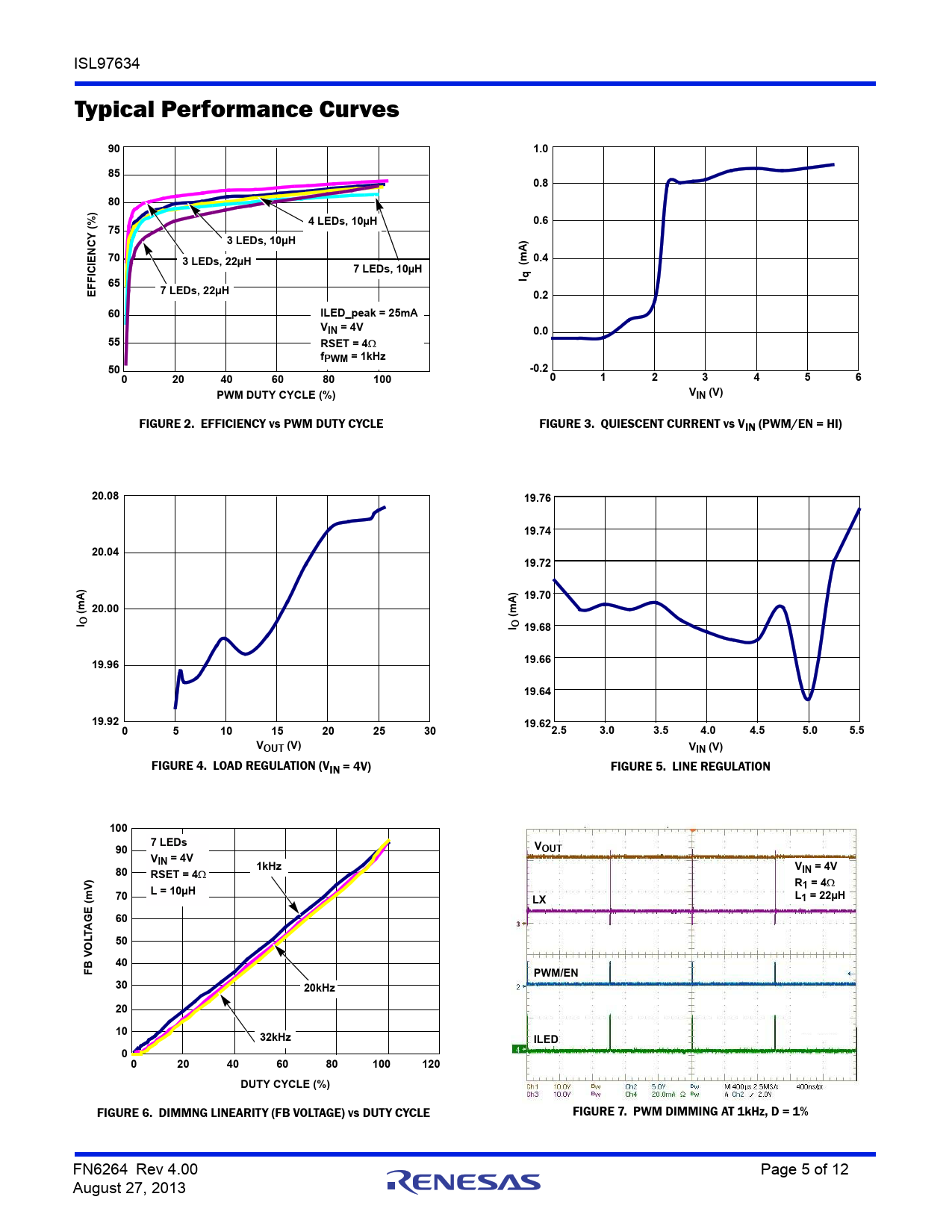 FIGURE 6. DIMMNG LINEARITY (FB VOLTAGE) vs DUTY CYCLE FIGURE 7. PWM DIMMING AT 1kHz, D = 1% FN6264 Rev 4.00 Page 5 of 12 August 27, 2013