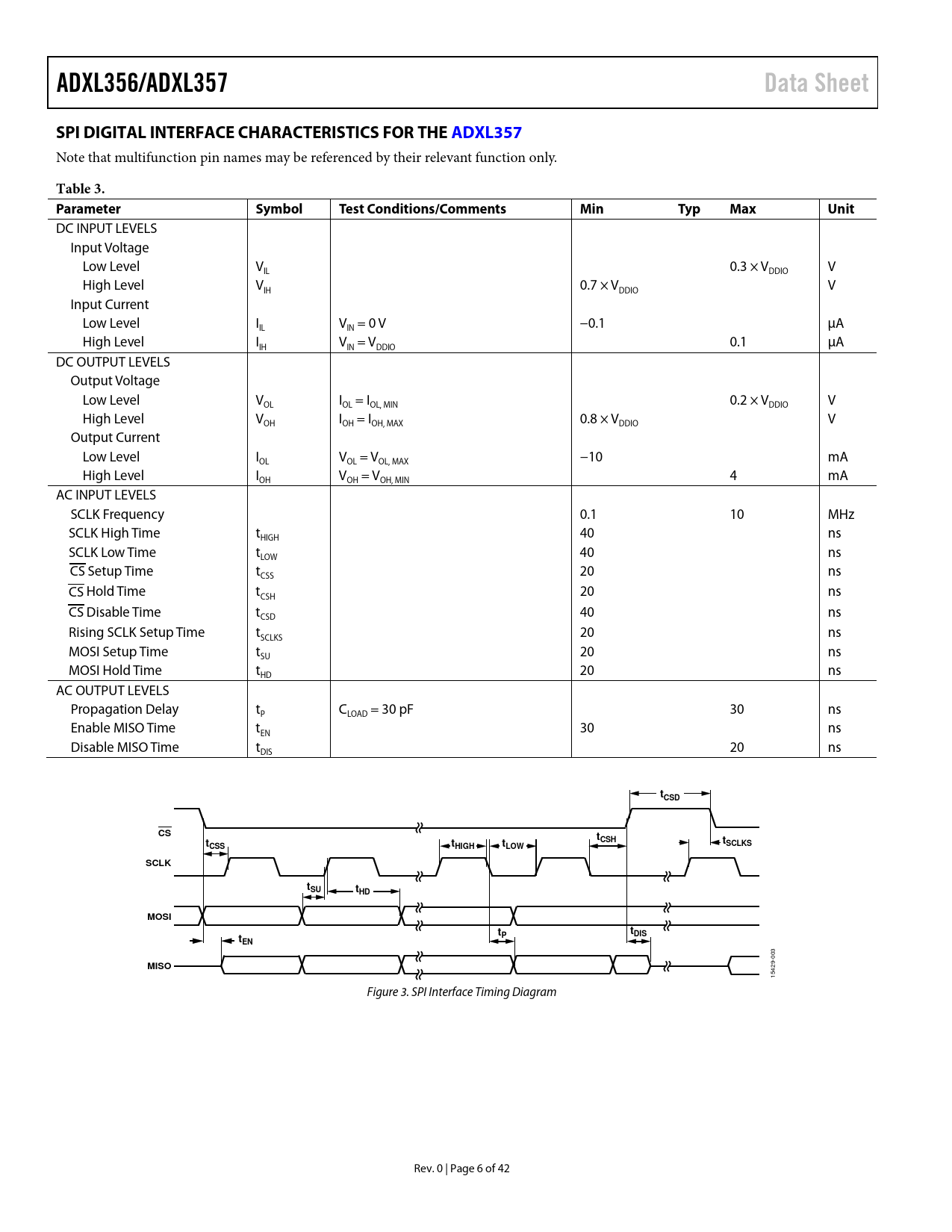 ADXL356/ADXL357. Data Sheet. SPI DIGITAL INTERFACE CHARACTERISTICS FOR THE ADXL357. Table 3. Parameter. Symbol
