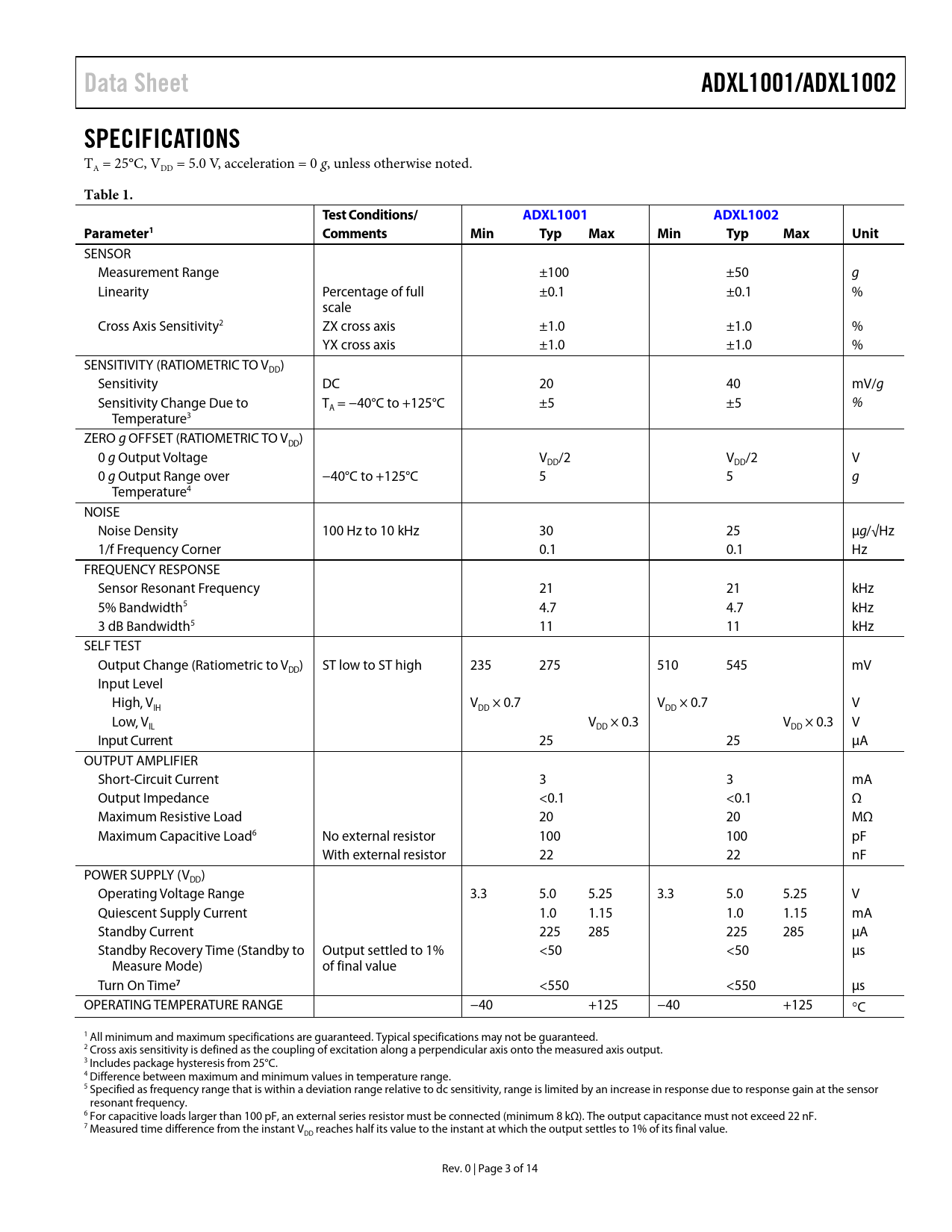 Data SheetADXL1001/ADXL1002SPECIFICATIONS TA = 25°C, VDD = 5.0 V, acceleration = 0 g, unless otherwise noted. Table 1.Test Conditions/ADXL1001ADXL1002Parameter1CommentsMinTypMaxMinTypMaxUnit SENSOR Measurement Range ±100 ±50 g Linearity Percentage of full ±0.1 ±0.1 % scale Cross Axis Sensitivity2 ZX cross axis ±1.0 ±1.0 % YX cross axis ±1.0 ±1.0 % SENSITIVITY (RATIOMETRIC TO V ) DD Sensitivity DC 20 40 mV/g Sensitivity Change Due to T = −40°C to +125°C ±5 ±5 % A Temperature3 ZERO g OFFSET (RATIOMETRIC TO V ) DD 0 g Output Voltage V /2 V /2 V DD DD 0 g Output Range over −40°C to +125°C 5 5 g Temperature4 NOISE Noise Density 100 Hz to 10 kHz 30 25 µg/√Hz 1/f Frequency Corner 0.1 0.1 Hz FREQUENCY RESPONSE Sensor Resonant Frequency 21 21 kHz 5% Bandwidth5 4.7 4.7 kHz 3 dB Bandwidth5 11 11 kHz SELF TEST Output Change (Ratiometric to V ) ST low to ST high 235 275 510 545 mV DD Input Level High, V V × 0.7 V × 0.7 V IH DD DD Low, V V × 0.3 V × 0.3 V IL DD DD Input Current 25 25 µA OUTPUT AMPLIFIER Short-Circuit Current 3 3 mA Output Impedance <0.1 <0.1 Ω Maximum Resistive Load 20 20 MΩ Maximum Capacitive Load6 No external resistor 100 100 pF With external resistor 22 22 nF POWER SUPPLY (V ) DD Operating Voltage Range 3.3 5.0 5.25 3.3 5.0 5.25 V Quiescent Supply Current 1.0 1.15 1.0 1.15 mA Standby Current 225 285 225 285 µA Standby Recovery Time (Standby to Output settled to 1% <50 <50 µs Measure Mode) of final value Turn On Time 7 <550 <550 µs OPERATING TEMPERATURE RANGE −40 +125 −40 +125 °C 1 All minimum and maximum specifications are guaranteed. Typical specifications may not be guaranteed. 2 Cross axis sensitivity is defined as the coupling of excitation along a perpendicular axis onto the measured axis output. 3 Includes package hysteresis from 25°C. 4 Difference between maximum and minimum values in temperature range. 5 Specified as frequency range that is within a deviation range relative to dc sensitivity, range is limited by an increase in response due to response gain at the sensor resonant frequency. 6 For capacitive loads larger than 100 pF, an external series resistor must be connected (minimum 8 kΩ). The output capacitance must not exceed 22 nF. 7 Measured time difference from the instant VDD reaches half its value to the instant at which the output settles to 1% of its final value. Rev. 0 | Page 3 of 14 Document Outline FEATURES APPLICATIONS FUNCTIONAL BLOCK DIAGRAM GENERAL DESCRIPTION TABLE OF CONTENTS REVISION HISTORY SPECIFICATIONS ABSOLUTE MAXIMUM RATINGS THERMAL RESISTANCE RECOMMENDED SOLDERING PROFILE ESD CAUTION PIN CONFIGURATION AND FUNCTION DESCRIPTIONS TYPICAL PERFORMANCE CHARACTERISTICS THEORY OF OPERATION MECHANICAL DEVICE OPERATION OPERATING MODES Measurement Mode Standby BANDWIDTH APPLICATIONS INFORMATION APPLICATION CIRCUIT ON DEMAND SELF TEST RATIOMETRIC OUTPUT VOLTAGE INTERFACING ANALOG OUTPUT BELOW 10 kHz INTERFACING ANALOG OUTPUT BEYOND 10 kHz OVERRANGE MECHANICAL CONSIDERATIONS FOR MOUNTING LAYOUT AND DESIGN RECOMMENDATIONS OUTLINE DIMENSIONS ORDERING GUIDE