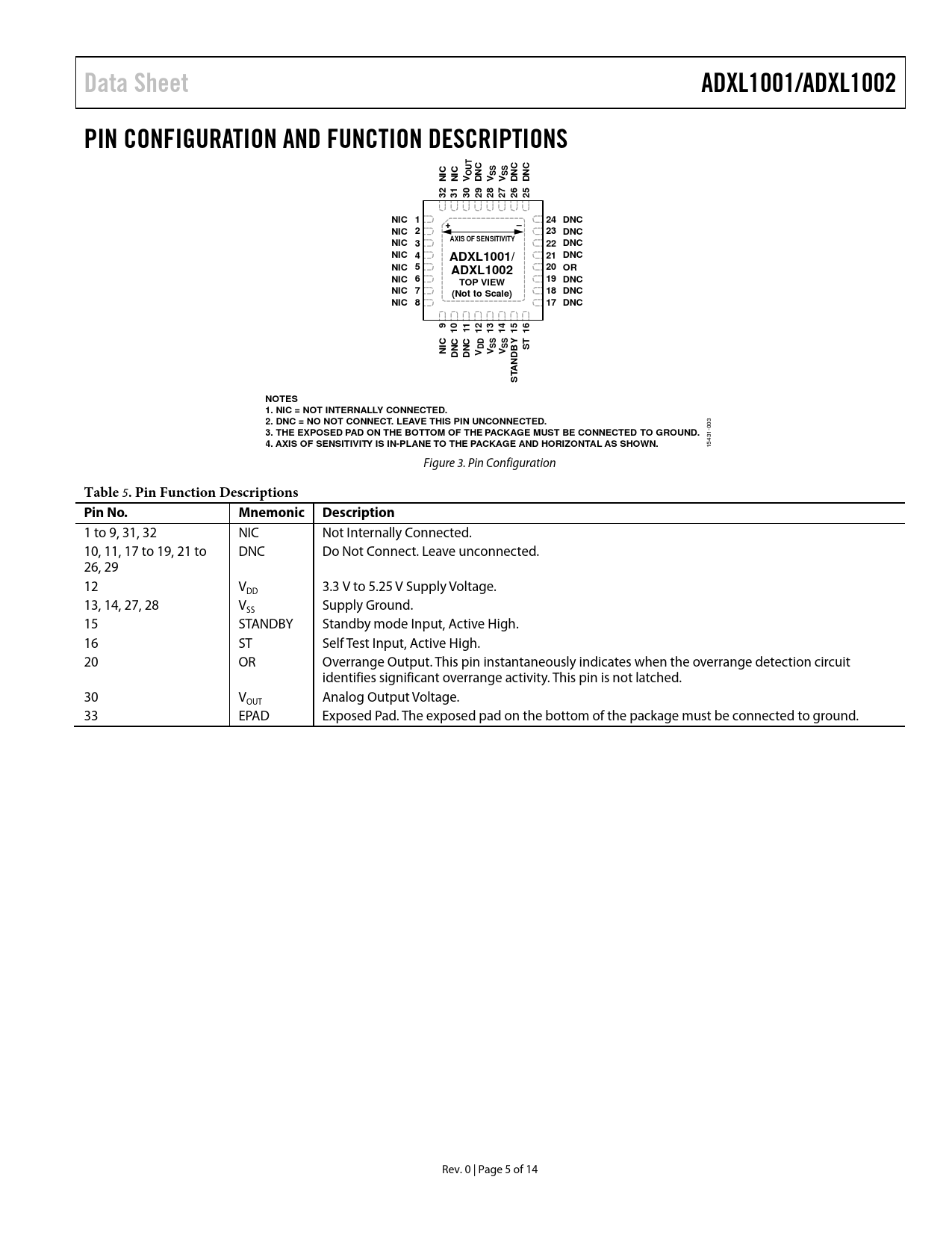 Data SheetADXL1001/ADXL1002PIN CONFIGURATION AND FUNCTION DESCRIPTIONSCCUT OSSSSNINIVDNCVVDNCDNC3231302928272625NIC 124 DNC+–NIC 223 DNCNICAXIS OF SENSITIVITY322 DNCNIC 421 DNCADXL1001/NIC 520 ORADXL1002NIC 619 DNCTOP VIEWNIC 718 DNC(Not to Scale)NIC 817 DNC911011213141516CYDDSSSSNISTDNCDNCVVVANDB T SNOTES 1. NIC = NOT INTERNALLY CONNECTED. 2. DNC = NO NOT CONNECT. LEAVE THIS PIN UNCONNECTED. 003 3. THE EXPOSED PAD ON THE BOTTOM OF THE PACKAGE MUST BE CONNECTED TO GROUND. 4. AXIS OF SENSITIVITY IS IN-PLANE TO THE PACKAGE AND HORIZONTAL AS SHOWN. 15431- Figure 3. Pin Configuration Table 5 . Pin Function Descriptions Pin No.Mnemonic Description 1 to 9, 31, 32 NIC Not Internally Connected. 10, 11, 17 to 19, 21 to DNC Do Not Connect. Leave unconnected. 26, 29 12 V 3.3 V to 5.25 V Supply Voltage. DD 13, 14, 27, 28 V Supply Ground. SS 15 STANDBY Standby mode Input, Active High. 16 ST Self Test Input, Active High. 20 OR Overrange Output. This pin instantaneously indicates when the overrange detection circuit identifies significant overrange activity. This pin is not latched. 30 V Analog Output Voltage. OUT 33 EPAD Exposed Pad. The exposed pad on the bottom of the package must be connected to ground. Rev. 0 | Page 5 of 14 Document Outline FEATURES APPLICATIONS FUNCTIONAL BLOCK DIAGRAM GENERAL DESCRIPTION TABLE OF CONTENTS REVISION HISTORY SPECIFICATIONS ABSOLUTE MAXIMUM RATINGS THERMAL RESISTANCE RECOMMENDED SOLDERING PROFILE ESD CAUTION PIN CONFIGURATION AND FUNCTION DESCRIPTIONS TYPICAL PERFORMANCE CHARACTERISTICS THEORY OF OPERATION MECHANICAL DEVICE OPERATION OPERATING MODES Measurement Mode Standby BANDWIDTH APPLICATIONS INFORMATION APPLICATION CIRCUIT ON DEMAND SELF TEST RATIOMETRIC OUTPUT VOLTAGE INTERFACING ANALOG OUTPUT BELOW 10 kHz INTERFACING ANALOG OUTPUT BEYOND 10 kHz OVERRANGE MECHANICAL CONSIDERATIONS FOR MOUNTING LAYOUT AND DESIGN RECOMMENDATIONS OUTLINE DIMENSIONS ORDERING GUIDE
