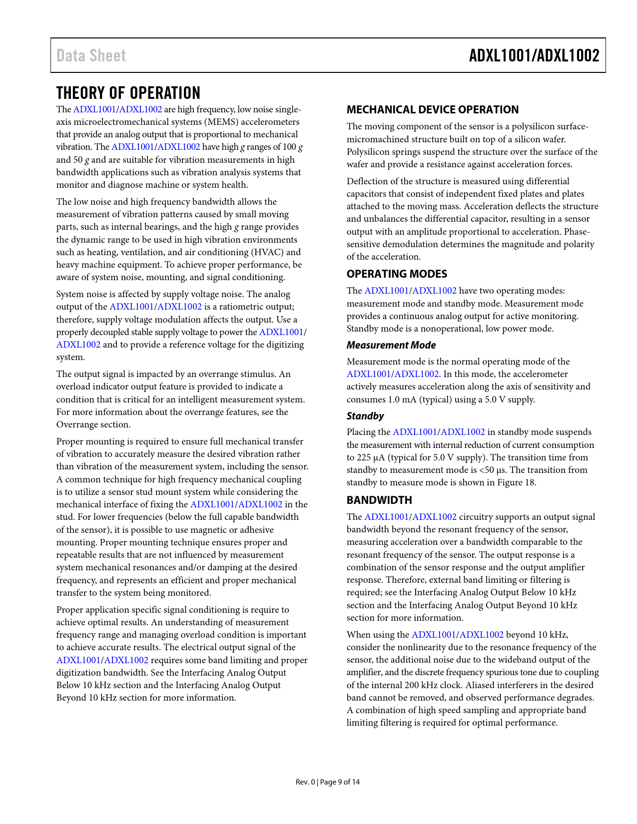 Data Sheet ADXL1001/ADXL1002 THEORY OF OPERATION MECHANICAL DEVICE OPERATION OPERATING MODES Measurement Mode Standby