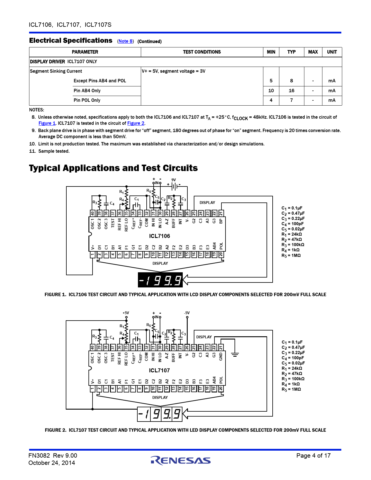 FIGURE 2. ICL7107 TEST CIRCUIT AND TYPICAL APPLICATION WITH LED DISPLAY COMPONENTS SELECTED FOR 200mV FULL SCALE FN3082 Rev 9.00 Page 4 of 17 October 24, 2014