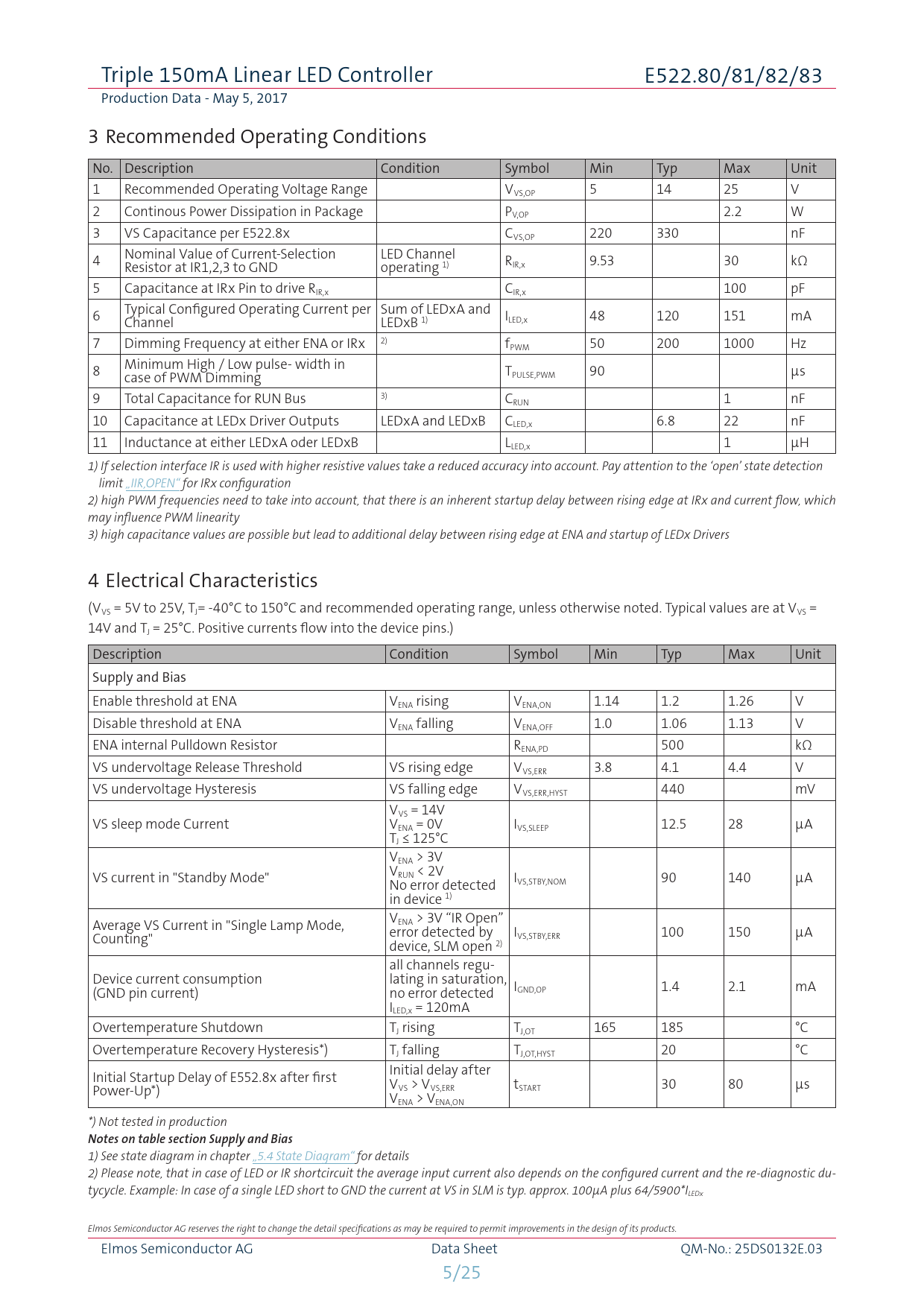 link to page 8 link to page 12 Triple 150mA Linear LED Controller E522.80/81/82/83 Production Data - May 5, 2017 3 Recommended Operating Conditions No. Description Condition Symbol Min Typ Max Unit 1 Recommended Operating Voltage Range VVS,OP 5 14 25 V 2 Continous Power Dissipation in Package PV,OP 2.2 W 3 VS Capacitance per E522.8x CVS,OP 220 330 nF 4 Nominal Value of Current-Selection LED Channel Resistor at IR1,2,3 to GND operating 1) RIR,x 9.53 30 kΩ 5 Capacitance at IRx Pin to drive RIR,x CIR,x 100 pF 6 Typical Configured Operating Current per Sum of LEDxA and Channel LEDxB 1) ILED,x 48 120 151 mA 7 Dimming Frequency at either ENA or IRx 2) fPWM 50 200 1000 Hz 8 Minimum High / Low pulse- width in case of PWM Dimming TPULSE,PWM 90 µs 9 Total Capacitance for RUN Bus 3) CRUN 1 nF 10 Capacitance at LEDx Driver Outputs LEDxA and LEDxB CLED,x 6.8 22 nF 11 Inductance at either LEDxA oder LEDxB LLED,x 1 µH 1) If selection interface IR is used with higher resistive values take a reduced accuracy into account. Pay attention to the ‘open’ state detection limit „IIR,OPEN“ for IRx configuration 2) high PWM frequencies need to take into account, that there is an inherent startup delay between rising edge at IRx and current flow, which may influence PWM linearity 3) high capacitance values are possible but lead to additional delay between rising edge at ENA and startup of LEDx Drivers 4 Electrical Characteristics (VVS = 5V to 25V, TJ= -40°C to 150°C and recommended operating range, unless otherwise noted. Typical values are at VVS = 14V and TJ = 25°C. Positive currents flow into the device pins.) Description Condition Symbol Min Typ Max Unit Supply and Bias Enable threshold at ENA VENA rising VENA,ON 1.14 1.2 1.26 V Disable threshold at ENA VENA falling VENA,OFF 1.0 1.06 1.13 V ENA internal Pulldown Resistor RENA,PD 500 kΩ VS undervoltage Release Threshold VS rising edge VVS,ERR 3.8 4.1 4.4 V VS undervoltage Hysteresis VS falling edge VVS,ERR,HYST 440 mV VVS = 14V VS sleep mode Current VENA = 0V IVS,SLEEP 12.5 28 µA TJ ≤ 125°C VENA > 3V VS current in "Standby Mode" VRUN < 2V No error detected IVS,STBY,NOM 90 140 µA in device 1) Average VS Current in "Single Lamp Mode, VENA > 3V “IR Open” Counting" error detected by IVS,STBY,ERR 100 150 µA device, SLM open 2) all channels regu- Device current consumption lating in saturation, (GND pin current) no error detected IGND,OP 1.4 2.1 mA ILED,x = 120mA Overtemperature Shutdown TJ rising TJ,OT 165 185 °C Overtemperature Recovery Hysteresis*) TJ falling TJ,OT,HYST 20 °C Initial Startup Delay of E552.8x after first Initial delay after Power-Up*) VVS > VVS,ERR tSTART 30 80 µs VENA > VENA,ON *) Not tested in production Notes on table section Supply and Bias 1) See state diagram in chapter „5.4 State Diagram“ for details 2) Please note, that in case of LED or IR shortcircuit the average input current also depends on the configured current and the re-diagnostic du- tycycle. Example: In case of a single LED short to GND the current at VS in SLM is typ. approx. 100µA plus 64/5900*ILEDx Elmos Semiconductor AG reserves the right to change the detail specifications as may be required to permit improvements in the design of its products. Elmos Semiconductor AG Data Sheet QM-No.: 25DS0132E.03 5/25