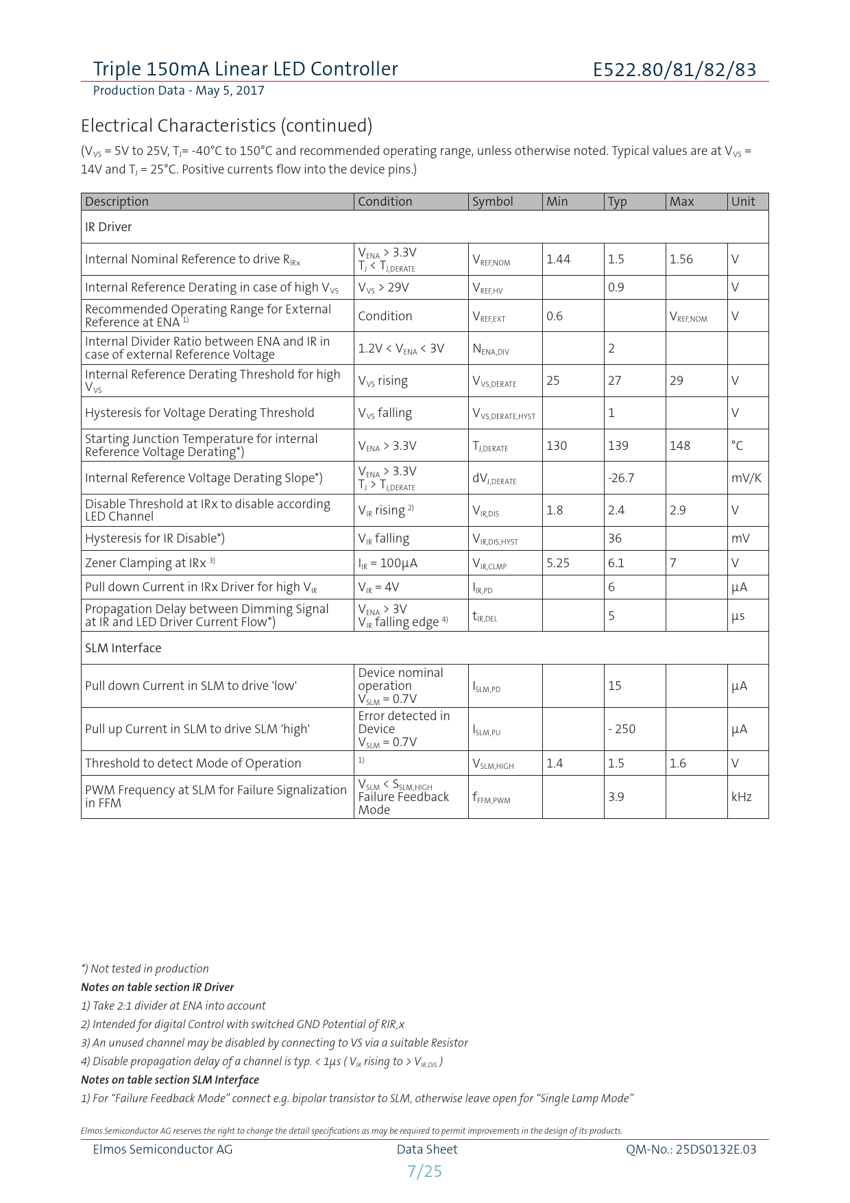 Triple 150mA Linear LED Controller E522.80/81/82/83 Production Data - May 5, 2017 Electrical Characteristics (continued) (VVS = 5V to 25V, TJ= -40°C to 150°C and recommended operating range, unless otherwise noted. Typical values are at VVS = 14V and TJ = 25°C. Positive currents flow into the device pins.) Description Condition Symbol Min Typ Max Unit IR Driver Internal Nominal Reference to drive R VENA > 3.3V IRx T VREF,NOM 1.44 1.5 1.56 V J < TJ,DERATE Internal Reference Derating in case of high VVS VVS > 29V VREF,HV 0.9 V Recommended Operating Range for External Reference at ENA 1) Condition VREF,EXT 0.6 VREF,NOM V Internal Divider Ratio between ENA and IR in case of external Reference Voltage 1.2V < VENA < 3V NENA,DIV 2 Internal Reference Derating Threshold for high V VVS rising VVS,DERATE 25 27 29 V VS Hysteresis for Voltage Derating Threshold VVS falling VVS,DERATE,HYST 1 V Starting Junction Temperature for internal Reference Voltage Derating*) VENA > 3.3V TJ,DERATE 130 139 148 °C Internal Reference Voltage Derating Slope*) VENA > 3.3V T dVJ,DERATE -26.7 mV/K J > TJ,DERATE Disable Threshold at IRx to disable according LED Channel VIR rising 2) VIR,DIS 1.8 2.4 2.9 V Hysteresis for IR Disable*) VIR falling VIR,DIS,HYST 36 mV Zener Clamping at IRx 3) IIR = 100µA VIR,CLMP 5.25 6.1 7 V Pull down Current in IRx Driver for high VIR VIR = 4V IIR,PD 6 µA Propagation Delay between Dimming Signal VENA > 3V at IR and LED Driver Current Flow*) VIR falling edge 4) tIR,DEL 5 µs SLM Interface Device nominal Pull down Current in SLM to drive 'low' operation ISLM,PD 15 µA VSLM = 0.7V Error detected in Pull up Current in SLM to drive SLM 'high' Device ISLM,PU - 250 µA VSLM = 0.7V Threshold to detect Mode of Operation 1) VSLM,HIGH 1.4 1.5 1.6 V PWM Frequency at SLM for Failure Signalization VSLM < SSLM,HIGH in FFM Failure Feedback fFFM,PWM 3.9 kHz Mode *) Not tested in production