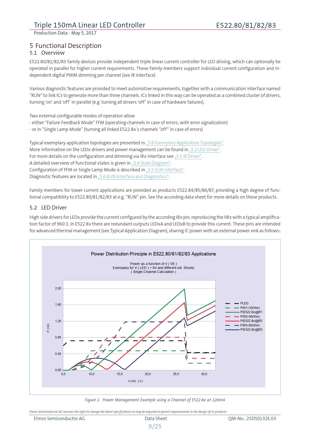 link to page 17 link to page 9 link to page 10 link to page 12 link to page 13 link to page 14 Triple 150mA Linear LED Controller E522.80/81/82/83 Production Data - May 5, 2017 5 Functional Description 5.1 Overview E522.80/81/82/83 family devices provide independent triple linear current controller for LED driving, which can optionally be operated in parallel for higher current requirements. These family members support individual current configuration and in- dependent digital PWM dimming per channel (see IR interface). Various diagnostic features are provided to meet automotive requirements, together with a communication interface named “RUN” to link ICs to generate more than three channels. ICs linked in this way can be operated as a combined cluster of drivers, turning ‘on’ and ‘off’ in parallel (e.g. turning all drivers ‘off’ in case of hardware failures). Two external configurable modes of operation allow - either “Failure Feedback Mode” FFM (operating channels in case of errors, with error signalization) - or in “Single Lamp Mode” (turning all linked E522.8x´s channels “off” in case of errors) Typical exemplary application topologies are presented in „5.8 Exemplary Application Topologies“. More information on the LEDx drivers and power management can be found in „5.2 LED Driver“. For more details on the configuration and dimming via IRx interface see „5.3 IR Driver“. A detailed overview of functional states is given in „5.4 State Diagram“. Configuration of FFM or Single Lamp Mode is described in „5.5 SLM Interface“. Diagnostic features are located in „5.6 RUN Interface and Diagnostics“. Family members for lower current applications are provided as products E522.84/85/86/87, providing a high degree of func- tional compatibility to E522.80/81/82/83 at e.g. “RUN” pin. See the according data sheet for more details on these products. 5.2 LED Driver High side drivers for LEDx provide the current configured by the according IRx pin, reproducing the IIRx with a typical amplifica- tion factor of 960:1. In E522.8x there are redundant outputs LEDxA and LEDxB to provide this current. These pins are intended for advanced thermal management (see Typical Application Diagram), sharing IC power with an external power sink as follows: Power Distribution Principle in E522.80/81/82/83 Applications Power as a function of V ( VS ) Exemplary for V ( LED ) = 6V and different ext. Shunts ( Single-Channel Calculation ) 2,00 1,60 PLED P(R1=33Ohm) P(E522.8x)@R1 P(R2=56Ohm) 1,20 P(E522.8x)@R2 ] P(R3=82Ohm) P(E522.8x)@R3 P [ W 0,80 0,40 0,005,0 10,0 15,0 20,0 25,0 30,0 V (VS) [ V ] Figure 1. Power Management Example using a Channel of E522.8x at 120mA Elmos Semiconductor AG reserves the right to change the detail specifications as may be required to permit improvements in the design of its products. Elmos Semiconductor AG Data Sheet QM-No.: 25DS0132E.03 9/25