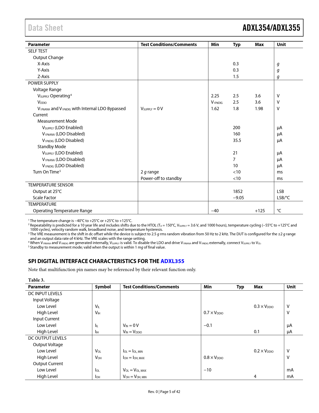 Data SheetADXL354/ADXL355ParameterTest Conditions/CommentsMinTypMaxUnit SELF TEST Output Change X-Axis 0.3 g Y-Axis 0.3 g Z-Axis 1.5 g POWER SUPPLY Voltage Range VSUPPLY Operating4 2.25 2.5 3.6 V VDDIO V1P8DIG 2.5 3.6 V V1P8ANA and V1P8DIG with Internal LDO Bypassed VSUPPLY = 0 V 1.62 1.8 1.98 V Current Measurement Mode VSUPPLY (LDO Enabled) 200 µA V1P8ANA (LDO Disabled) 160 µA V1P8DIG (LDO Disabled) 35.5 µA Standby Mode VSUPPLY (LDO Enabled) 21 µA V1P8ANA (LDO Disabled) 7 µA V1P8DIG (LDO Disabled) 10 µA Turn On Time5 2 g range <10 ms Power-off to standby <10 ms TEMPERATURE SENSOR Output at 25°C 1852 LSB Scale Factor −9.05 LSB/°C TEMPERATURE Operating Temperature Range −40 +125 °C 1 The temperature change is −40°C to +25°C or +25°C to +125°C. 2 Repeatability is predicted for a 10 year life and includes shifts due to the HTOL (TA = 150°C, VSUPPLY = 3.6 V, and 1000 hours), temperature cycling (−55°C to +125°C and 1000 cycles), velocity random walk, broadband noise, and temperature hysteresis. 3 The VRE measurement is the shift in dc offset while the device is subject to 2.5 g rms random vibration from 50 Hz to 2 kHz. The DUT is configured for the ±2 g range and an output data rate of 4 kHz. The VRE scales with the range setting. 4 When V1P8ANA and V1P8DIG are generated internally, VSUPPLY is valid. To disable the LDO and drive V1P8ANA and V1P8DIG externally, connect VSUPPLY to VSS. 5 Standby to measurement mode; valid when the output is within 1 mg of final value. SPI DIGITAL INTERFACE CHARACTERISTICS FOR THE ADXL355 Note that multifunction pin names may be referenced by their relevant function only. Table 3. ParameterSymbolTest Conditions/CommentsMinTypMaxUnit DC INPUT LEVELS Input Voltage Low Level VIL 0.3 × VDDIO V High Level VIH 0.7 × VDDIO V Input Current Low Level IIL VIN = 0 V −0.1 µA High Level IIH VIN = VDDIO 0.1 µA DC OUTPUT LEVELS Output Voltage Low Level VOL IOL = IOL, MIN 0.2 × VDDIO V High Level VOH IOH = IOH, MAX 0.8 × VDDIO V Output Current Low Level IOL VOL = VOL, MAX −10 mA High Level IOH VOH = VOH, MIN 4 mA Rev. 0 | Page 5 of 42 Document Outline FEATURES APPLICATIONS GENERAL DESCRIPTION FUNCTIONAL BLOCK DIAGRAMS TABLE OF CONTENTS REVISION HISTORY SPECIFICATIONS ANALOG OUTPUT FOR THE ADXL354 DIGITAL OUTPUT FOR THE ADXL355 SPI DIGITAL INTERFACE CHARACTERISTICS FOR THE ADXL355 I2C DIGITAL INTERFACE CHARACTERISTICS FOR THE ADXL355 ABSOLUTE MAXIMUM RATINGS THERMAL RESISTANCE ESD CAUTION PIN CONFIGURATIONS AND FUNCTION DESCRIPTIONS TYPICAL PERFORMANCE CHARACTERISTICS ROOT ALLAN VARIANCE (RAV) ADXL355 CHARACTERISTICS THEORY OF OPERATION ANALOG OUTPUT DIGITAL OUTPUT AXES OF ACCELERATION SENSITIVITY POWER SEQUENCING POWER SUPPLY DESCRIPTION VSUPPLY V1P8ANA V1P8DIG VDDIO OVERRANGE PROTECTION SELF TEST FILTER SERIAL COMMUNICATIONS SPI PROTOCOL I2C PROTOCOL READING ACCELERATION OR TEMPERATURE DATA FROM THE INTERFACE FIFO INTERRUPTS DATA_RDY DRDY PIN FIFO_FULL FIFO_OVR ACTIVITY NVM_BUSY EXTERNAL SYNCHRONIZATION AND INTERPOLATION EXT_SYNC = 00—No External Sync or Interpolation EXT_SYNC = 10—External Sync with Interpolation EXT_SYNC = 01—External Sync and External Clock ADXL355 REGISTER MAP REGISTER DEFINITIONS ANALOG DEVICES ID REGISTER Address: 0x00, Reset: 0xAD, Name: DEVID_AD ANALOG DEVICES MEMS ID REGISTER Address: 0x01, Reset: 0x1D, Name: DEVID_MST DEVICE ID REGISTER Address: 0x02, Reset: 0xED, Name: PARTID PRODUCT REVISION ID REGISTER Address: 0x03, Reset: 0x00, Name: REVID STATUS REGISTER Address: 0x04, Reset: 0x00, Name: STATUS FIFO ENTRIES REGISTER Address: 0x05, Reset: 0x00, Name: FIFO_ENTRIES TEMPERATURE DATA REGISTERS Address: 0x06, Reset: 0x00, Name: TEMP2 Address: 0x07, Reset: 0x00, Name: TEMP1 X-AXIS DATA REGISTERS Address: 0x08, Reset: 0x00, Name: XDATA3 Address: 0x09, Reset: 0x00, Name: XDATA2 Address: 0x0A, Reset: 0x00, Name: XDATA1 Y-AXIS DATA REGISTERS Address: 0x0B, Reset: 0x00, Name: YDATA3 Address: 0x0C, Reset: 0x00, Name: YDATA2 Address: 0x0D, Reset: 0x00, Name: YDATA1 Z-AXIS DATA REGISTERS Address: 0x0E, Reset: 0x00, Name: ZDATA3 Address: 0x0F, Reset: 0x00, Name: ZDATA2 Address: 0x10, Reset: 0x00, Name: ZDATA1 FIFO ACCESS REGISTER Address: 0x11, Reset: 0x00, Name: FIFO_DATA X-AXIS OFFSET TRIM REGISTERS Address: 0x1E, Reset: 0x00, Name: OFFSET_X_H Address: 0x1F, Reset: 0x00, Name: OFFSET_X_L Y-AXIS OFFSET TRIM REGISTERS Address: 0x20, Reset: 0x00, Name: OFFSET_Y_H Address: 0x21, Reset: 0x00, Name: OFFSET_Y_L Z-AXIS OFFSET TRIM REGISTERS Address: 0x22, Reset: 0x00, Name: OFFSET_Z_H Address: 0x23, Reset: 0x00, Name: OFFSET_Z_L ACTIVITY ENABLE REGISTER Address: 0x24, Reset: 0x00, Name: ACT_EN ACTIVITY THRESHOLD REGISTERS Address: 0x25, Reset: 0x00, Name: ACT_THRESH_H Address: 0x26, Reset: 0x00, Name: ACT_THRESH_L ACTIVITY COUNT REGISTER Address: 0x27, Reset: 0x01, Name: ACT_COUNT FILTER SETTINGS REGISTER Address: 0x28, Reset: 0x00, Name: Filter FIFO SAMPLES REGISTER Address: 0x29, Reset: 0x60, Name: FIFO_SAMPLES INTERRUPT PIN (INTx) FUNCTION MAP REGISTER Address: 0x2A, Reset: 0x00, Name: INT_MAP DATA SYNCHRONIZATION Address: 0x2B, Reset: 0x00, Name: Sync I2C SPEED, INTERRUPT POLARITY, AND RANGE REGISTER Address: 0x2C, Reset: 0x81, Name: Range POWER CONTROL REGISTER Address: 0x2D, Reset: 0x01, Name: POWER_CTL SELF TEST REGISTER Address: 0x2E, Reset: 0x00, Name: SELF_TEST RESET REGISTER Address: 0x2F, Reset: 0x00, Name: Reset RECOMMENDED SOLDERING PROFILE PCB FOOTPRINT PATTERN PACKAGING AND ORDERING INFORMATION OUTLINE DIMENSIONS BRANDING INFORMATION ORDERING GUIDE