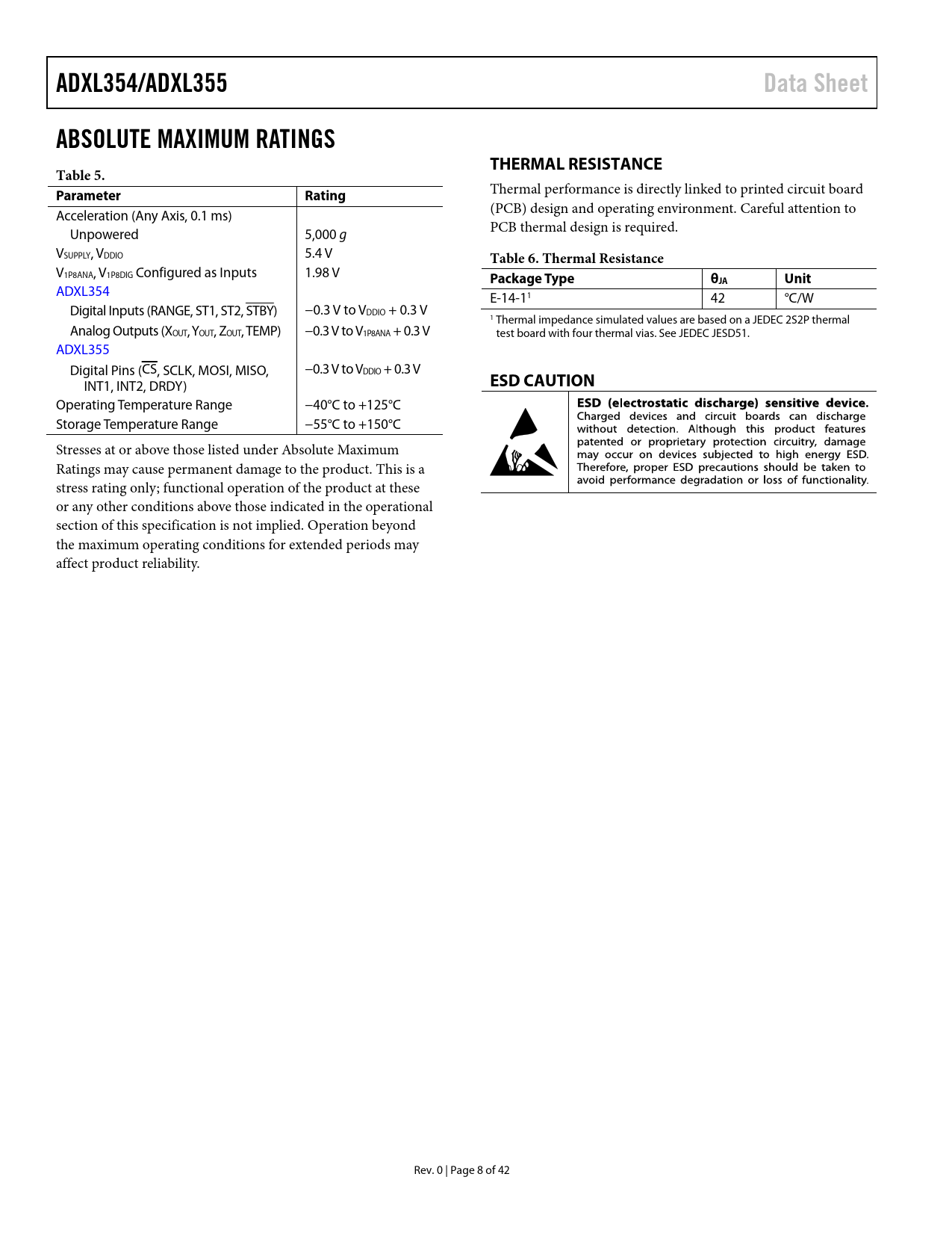 ADXL354/ADXL355. Data Sheet. ABSOLUTE MAXIMUM RATINGS. THERMAL RESISTANCE. Table 5. Parameter Rating. Table 6. Thermal Resistance