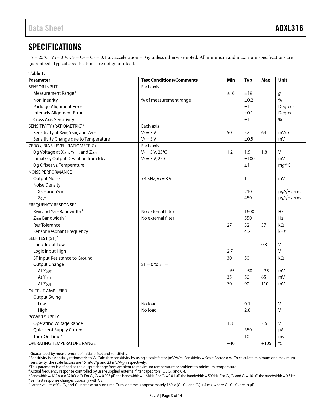 Data SheetADXL316SPECIFICATIONS TA = 25°C, VS = 3 V, CX = CY = CZ = 0.1 µF, acceleration = 0 g, unless otherwise noted. All minimum and maximum specifications are guaranteed. Typical specifications are not guaranteed. Table 1. ParameterTest Conditions/CommentsMinTypMaxUnit SENSOR INPUT Each axis Measurement Range1 ±16 ±19 g Nonlinearity % of measurement range ±0.2 % Package Alignment Error ±1 Degrees Interaxis Alignment Error ±0.1 Degrees Cross Axis Sensitivity ±1 % SENSITIVITY (RATIOMETRIC)2 Each axis Sensitivity at XOUT, YOUT, and ZOUT VS = 3 V 50 57 64 mV/g Sensitivity Change due to Temperature3 VS = 3 V ±0.5 mV ZERO g BIAS LEVEL (RATIOMETRIC) Each axis 0 g Voltage at XOUT, YOUT, and ZOUT VS = 3 V, 25°C 1.2 1.5 1.8 V Initial 0 g Output Deviation from Ideal VS = 3 V, 25°C ±100 mV 0 g Offset vs. Temperature ±1 mg/°C NOISE PERFORMANCE Output Noise <4 kHz, VS = 3 V 1 mV Noise Density XOUT and YOUT 210 µg/√Hz rms ZOUT 450 µg/√Hz rms FREQUENCY RESPONSE4 XOUT and YOUT Bandwidth5 No external filter 1600 Hz ZOUT Bandwidth 5 No external filter 550 Hz RFILT Tolerance 27 32 37 kΩ Sensor Resonant Frequency 4.2 kHz SELF TEST (ST)6 Logic Input Low 0.3 V Logic Input High 2.7 V ST Input Resistance to Ground 30 50 kΩ Output Change ST = 0 to ST = 1 At XOUT −65 −50 −35 mV At YOUT 35 50 65 mV At ZOUT 70 90 110 mV OUTPUT AMPLIFIER Output Swing Low No load 0.1 V High No load 2.8 V POWER SUPPLY Operating Voltage Range 1.8 3.6 V Quiescent Supply Current 350 µA Turn-On Time7 10 ms OPERATING TEMPERATURE RANGE −40 +105 °C 1 Guaranteed by measurement of initial offset and sensitivity. 2 Sensitivity is essentially ratiometric to VS. Calculate sensitivity by using a scale factor (mV/V/g). Sensitivity = Scale Factor × VS. To calculate minimum and maximum sensitivity, the scale factors are 15 mV/V/g and 23 mV/V/g, respectively. 3 This parameter is defined as the output change from ambient to maximum temperature or ambient to minimum temperature. 4 Actual frequency response control ed by user-supplied external filter capacitors (CX, CY, and CZ). 5 Bandwidth = 1/(2 × π × 32 kΩ × C). For CX, CY = 0.003 µF, the bandwidth = 1.6 kHz. For CZ = 0.01 µF, the bandwidth = 500 Hz. For CX, CY, and CZ = 10 µF, the bandwidth = 0.5 Hz. 6 Self test response changes cubically with VS. 7 Larger values of CX, CY, and CZ increase turn-on time. Turn-on time is approximately 160 × (CX, CY, and CZ) + 4 ms, where CX, CY, CZ are in µF. Rev. A | Page 3 of 14 Document Outline FEATURES APPLICATIONS GENERAL DESCRIPTION FUNCTIONAL BLOCK DIAGRAM TABLE OF CONTENTS REVISION HISTORY SPECIFICATIONS ABSOLUTE MAXIMUM RATINGS ESD CAUTION PIN CONFIGURATION AND FUNCTION DESCRIPTIONS TYPICAL PERFORMANCE CHARACTERISTICS THEORY OF OPERATION MECHANICAL SENSOR PERFORMANCE APPLICATIONS INFORMATION POWER SUPPLY DECOUPLING SETTING THE BANDWIDTH USING CX, CY, AND CZ SELF TEST DESIGN TRADE-OFFS FOR SELECTING FILTER CHARACTERISTICS: THE NOISE/BW TRADE-OFF USE WITH OPERATING VOLTAGES OTHER THAN 3 V AXES OF ACCELERATION SENSITIVITY LAYOUT AND DESIGN RECOMMENDATIONS OUTLINE DIMENSIONS ORDERING GUIDE AUTOMOTIVE PRODUCTS
