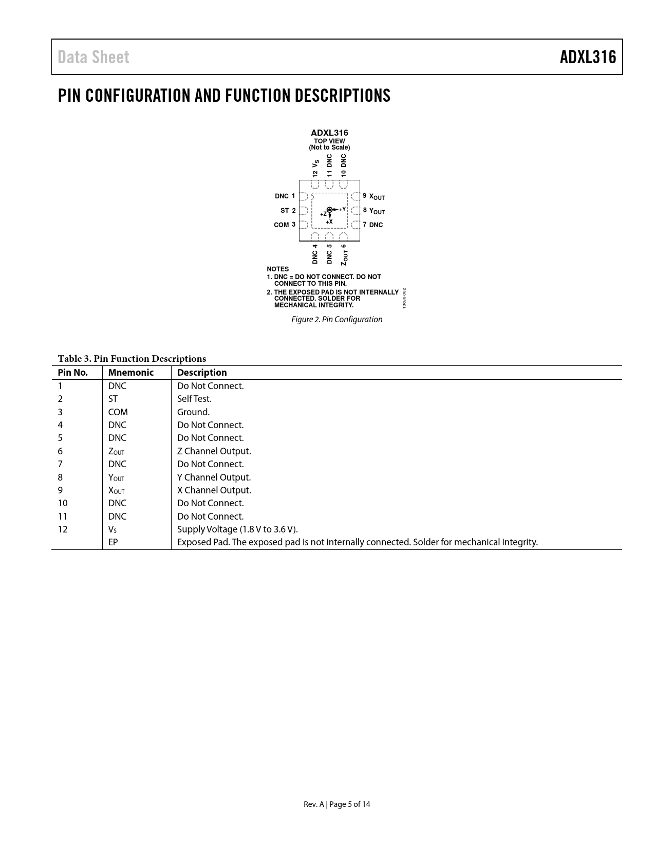 Data Sheet ADXL316 PIN CONFIGURATION AND FUNCTION DESCRIPTIONS TOP VIEW (Not to Scale) DNC DNC 1 9 XOUT ST 2 8 Y OUT COM 3 7 DNC