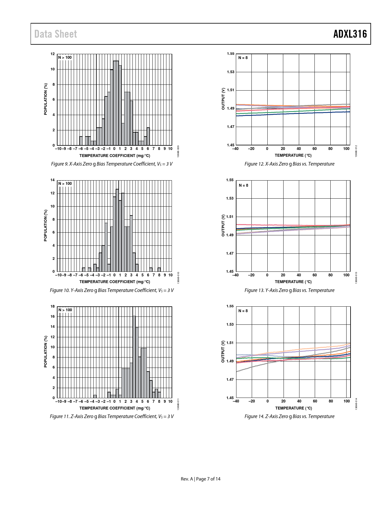Data SheetADXL316121.55N > 100N = 8101.53)8% (1.51(V) TTION6APULT UPUO 1.49PO41.47201.45–10 –9 –8 –7 –6 –5 –4 –3 –2 –1 0 1 2 3 4 5 6 7 8 9 10 009 –40–20020406080100 012 TEMPERATURE COEFFICIENT (mg/°C)TEMPERATURE (°C) 13686- 13686- Figure 9. X-Axis Zero g Bias Temperature Coefficient, VS = 3 V Figure 12. X-Axis Zero g Bias vs. Temperature 141.55N > 100N = 8121.5310) % (1.518(V) TTION APULT6UPUO 1.49PO41.47201.45–10 –9 –8 –7 –6 –5 –4 –3 –2 –1 0 1 2 3 4 5 6 7 8 9 10 010 –40–20020406080100 013 TEMPERATURE COEFFICIENT (mg/°C) 13686- TEMPERATURE (°C) 13686- Figure 10. Y-Axis Zero g Bias Temperature Coefficient, VS = 3 V Figure 13. Y-Axis Zero g Bias vs. Temperature 181.55N > 100N = 8161.5314)12% (1.5110(V) TTION APUL8T UPUO 1.49PO641.4720 1 1.45–10–9 –8 –7 –6 –5 –4 –3 –2 –1 0 1 2 3 4 5 6 7 8 9 10 1 0 –40–20020406080100 014 TEMPERATURE COEFFICIENT (mg/°C)TEMPERATURE (°C) 13686- 13686- Figure 11. Z-Axis Zero g Bias Temperature Coefficient, VS = 3 V Figure 14. Z-Axis Zero g Bias vs. Temperature Rev. A | Page 7 of 14 Document Outline FEATURES APPLICATIONS GENERAL DESCRIPTION FUNCTIONAL BLOCK DIAGRAM TABLE OF CONTENTS REVISION HISTORY SPECIFICATIONS ABSOLUTE MAXIMUM RATINGS ESD CAUTION PIN CONFIGURATION AND FUNCTION DESCRIPTIONS TYPICAL PERFORMANCE CHARACTERISTICS THEORY OF OPERATION MECHANICAL SENSOR PERFORMANCE APPLICATIONS INFORMATION POWER SUPPLY DECOUPLING SETTING THE BANDWIDTH USING CX, CY, AND CZ SELF TEST DESIGN TRADE-OFFS FOR SELECTING FILTER CHARACTERISTICS: THE NOISE/BW TRADE-OFF USE WITH OPERATING VOLTAGES OTHER THAN 3 V AXES OF ACCELERATION SENSITIVITY LAYOUT AND DESIGN RECOMMENDATIONS OUTLINE DIMENSIONS ORDERING GUIDE AUTOMOTIVE PRODUCTS