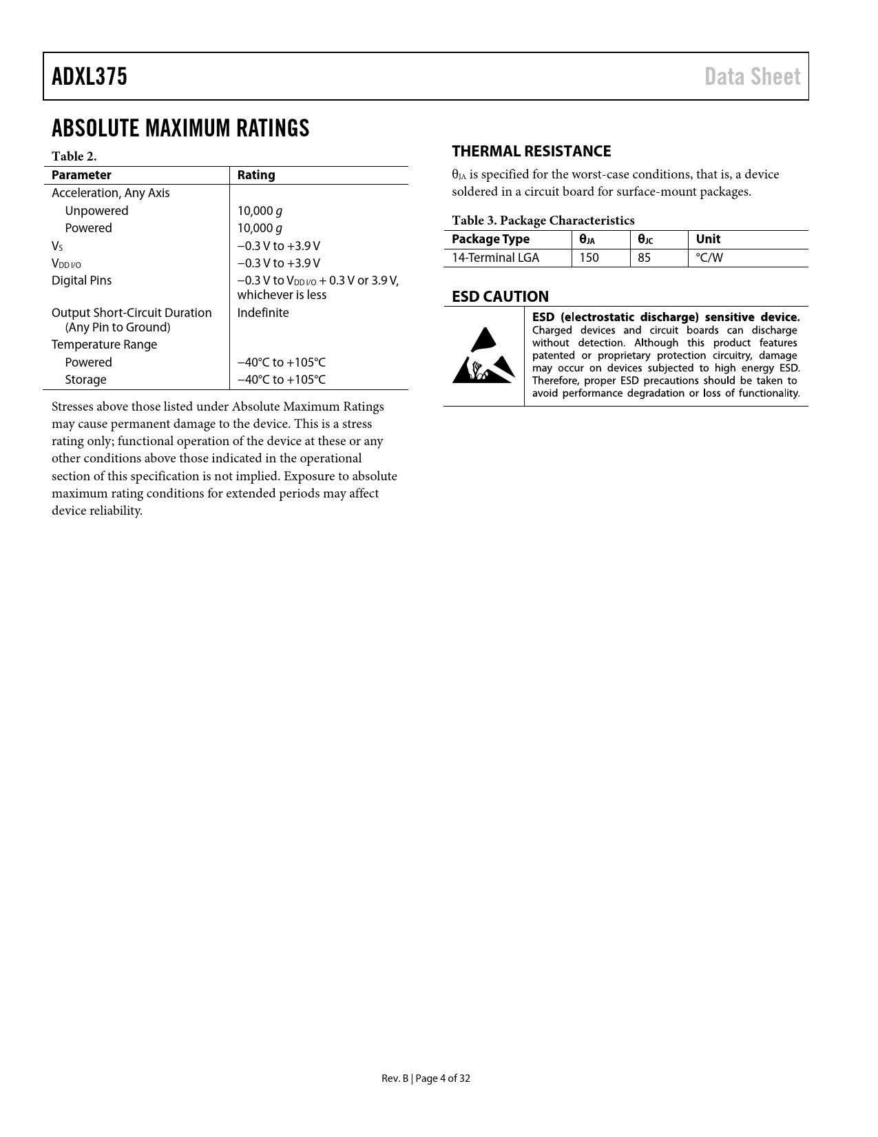 ADXL375Data SheetABSOLUTE MAXIMUM RATINGS Table 2.THERMAL RESISTANCEParameterRating θJA is specified for the worst-case conditions, that is, a device Acceleration, Any Axis soldered in a circuit board for surface-mount packages. Unpowered 10,000 g Powered 10,000 g Table 3. Package Characteristics V Package TypeθJAθJCUnit S −0.3 V to +3.9 V V 14-Terminal LGA 150 85 °C/W DD I/O −0.3 V to +3.9 V Digital Pins −0.3 V to V DD I/O + 0.3 V or 3.9 V, whichever is less ESD CAUTION Output Short-Circuit Duration Indefinite (Any Pin to Ground) Temperature Range Powered −40°C to +105°C Storage −40°C to +105°C Stresses above those listed under Absolute Maximum Ratings may cause permanent damage to the device. This is a stress rating only; functional operation of the device at these or any other conditions above those indicated in the operational section of this specification is not implied. Exposure to absolute maximum rating conditions for extended periods may affect device reliability. Rev. B | Page 4 of 32 Document Outline Features Applications General Description Functional Block Diagram Table of Contents Revision History Specifications Absolute Maximum Ratings Thermal Resistance ESD Caution Soldering Profile Pin Configuration and Function Descriptions Typical Performance Characteristics Theory of Operation Power Sequencing Current Consumption and Output Data Rate Power Saving Modes Low Power Mode Autosleep Mode Standby Mode FIFO Buffer Bypass Mode FIFO Mode Stream Mode Trigger Mode Retrieving Data from the FIFO Buffer Self-Test Interrupts Enabling and Disabling Interrupts Clearing Interrupts Bits in the Interrupt Registers DATA_READY Bit SINGLE_SHOCK Bit DOUBLE_SHOCK Bit Activity Bit Inactivity Bit Watermark Bit Overrun Bit Serial Communications SPI Mode Preventing Bus Traffic Errors I2C Mode Register Map Register Descriptions Register 0x00—DEVID (Read Only) Register 0x1D—THRESH_SHOCK (Read/Write) Register 0x1E, Register 0x1F, Register 0x20—OFSX, OFSY, OFSZ (Read/Write) Register 0x21—DUR (Read/Write) Register 0x22—Latent (Read/Write) Register 0x23—Window (Read/Write) Register 0x24—THRESH_ACT (Read/Write) Register 0x25—THRESH_INACT (Read/Write) Register 0x26—TIME_INACT (Read/Write) Register 0x27—ACT_INACT_CTL (Read/Write) ACT AC/DC and INACT AC/DC Bits ACT_x Enable and INACT_x Enable Bits Register 0x2A—SHOCK_AXES (Read/Write) Suppress Bit SHOCK_x Enable Bits Register 0x2B—ACT_SHOCK_STATUS (Read Only) ACT_x Source and SHOCK_x Source Bits Asleep Bit Register 0x2C—BW_RATE (Read/Write) LOW_POWER Bit Rate Bits Register 0x2D—POWER_CTL (Read/Write) Link Bit AUTO_SLEEP Bit Measure Bit Sleep Bit Wakeup Bits Register 0x2E—INT_ENABLE (Read/Write) Register 0x2F—INT_MAP (Read/Write) Register 0x30—INT_SOURCE (Read Only) Register 0x31—DATA_FORMAT (Read/Write) SELF_TEST Bit SPI Bit INT_INVERT Bit Justify Bit Register 0x32 to Register 0x37—DATAX0, DATAX1, DATAY0, DATAY1, DATAZ0, DATAZ1 (Read Only) Register 0x38—FIFO_CTL (Read/Write) FIFO_MODE Bits Trigger Bit Samples Bits Register 0x39—FIFO_STATUS (Read Only) FIFO_TRIG Bit Entries Bits Applications Information Power Supply Decoupling Mechanical Considerations for Mounting Shock Detection Threshold Detection and Bandwidth Link Mode Sleep Mode vs. Low Power Mode Offset Calibration Data Formatting at Output Data Rates of 3200 Hz and 1600 Hz Using Self-Test Axes of Acceleration Sensitivity Layout and Design Recommendations Package Information Outline Dimensions Ordering Guide