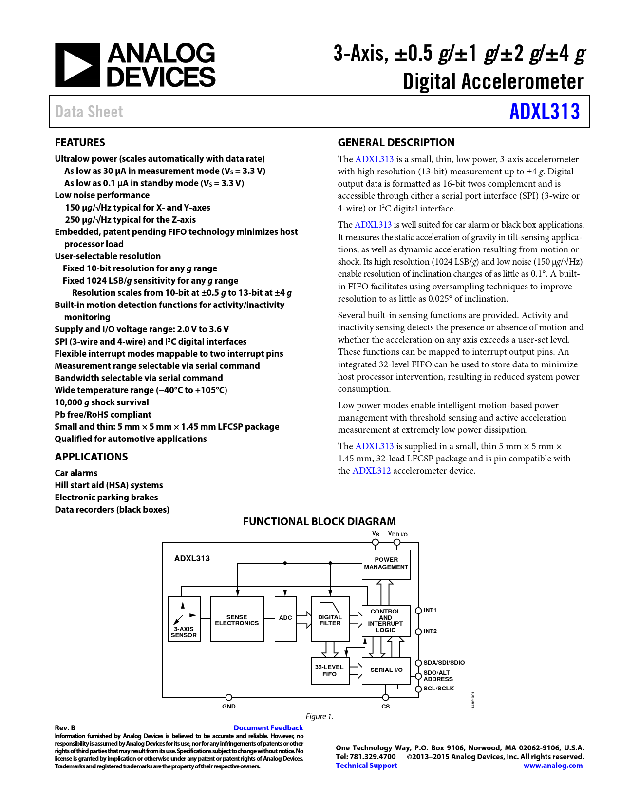 Hill start aid (HSA) systems Electronic parking brakes Data recorders (black boxes) FUNCTIONAL BLOCK DIAGRAM VS VDD I/O ADXL313 POWER MANAGEMENT CONTROL INT1 SENSE ADC DIGITAL AND ELECTRONICS FILTER INTERRUPT 3-AXIS LOGIC INT2 SENSOR SDA/SDI/SDIO 32-LEVEL SERIAL I/O SDO/ALT FIFO ADDRESS SCL/SCLK
