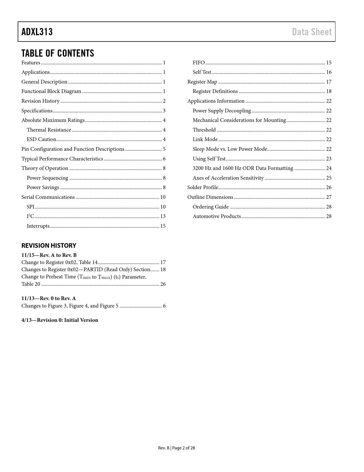 ADXL313 Data Sheet TABLE OF CONTENTS REVISION HISTORY 11/15—Rev A to Rev B 11/13—Rev 0 to Rev A