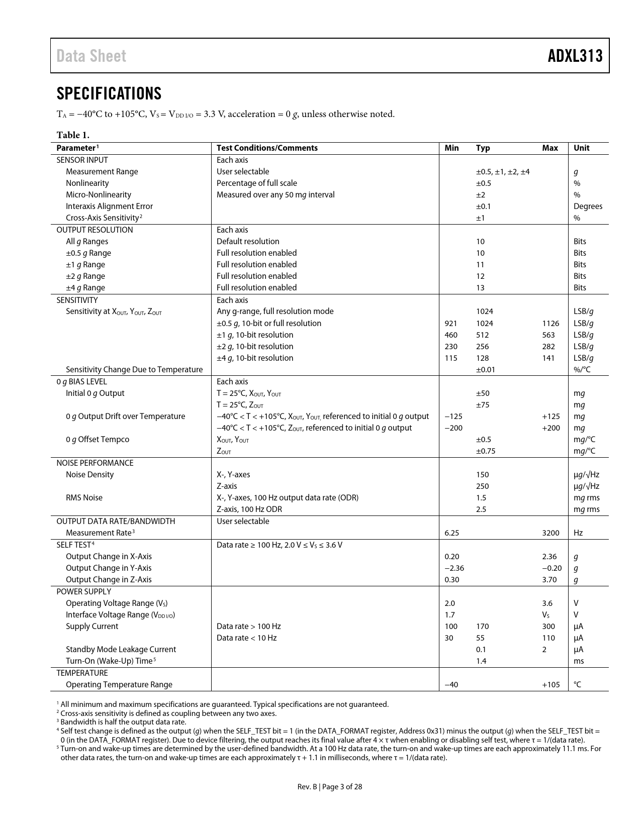Data Sheet ADXL313 SPECIFICATIONS Table 1 Parameter1 Test Conditions/Comments Min Typ Max Unit