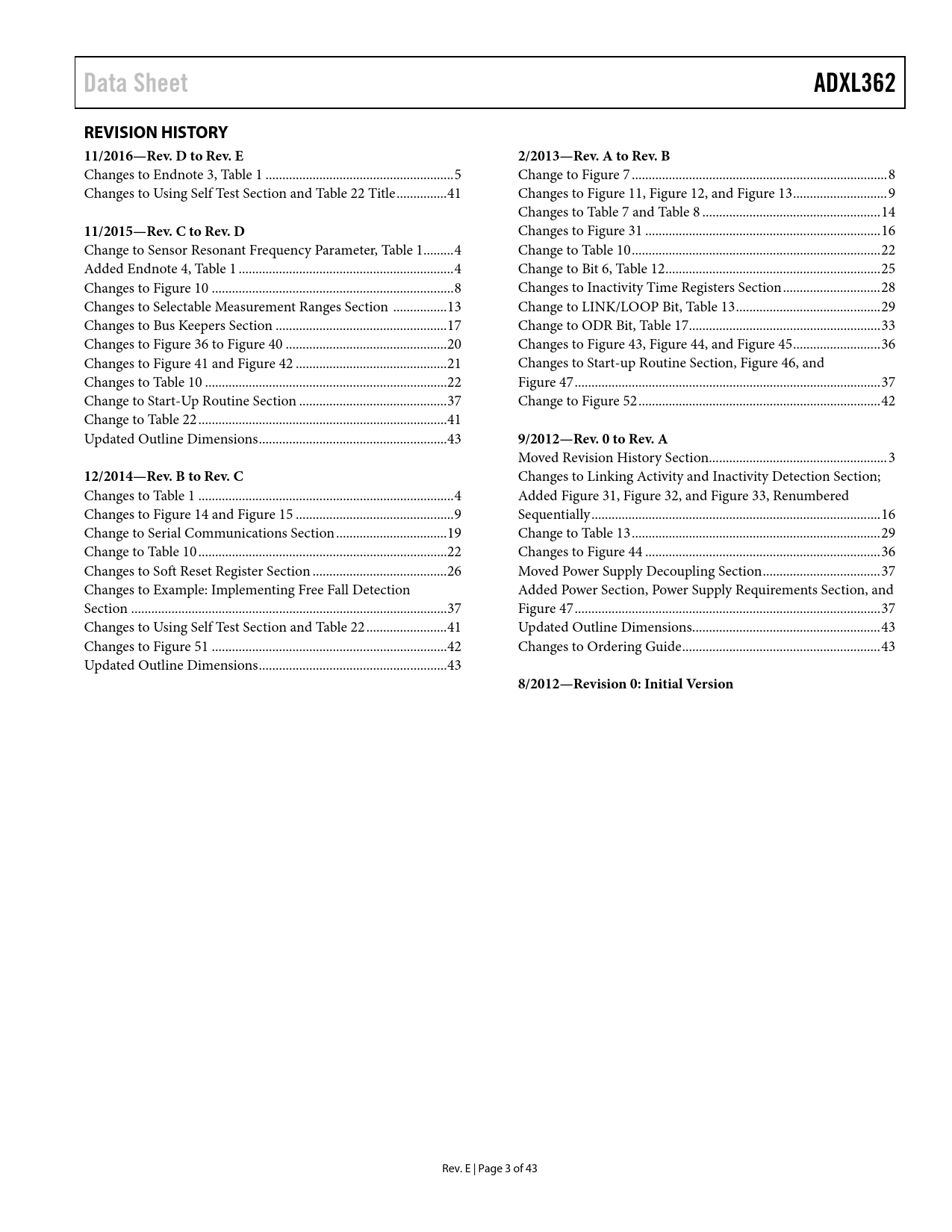 Páginas / Página45 / 5 — Data Sheet. ADXL362. REVISION HISTORY 11/2016—Rev. D to Rev. E. …