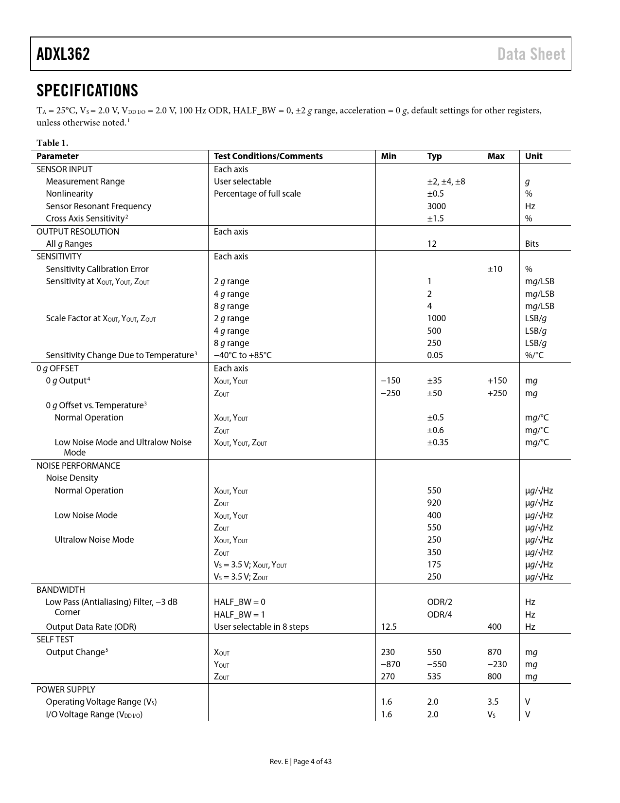 ADXL362 Data Sheet SPECIFICATIONS Table 1 Parameter Test Conditions/Comments Min Typ Max Unit