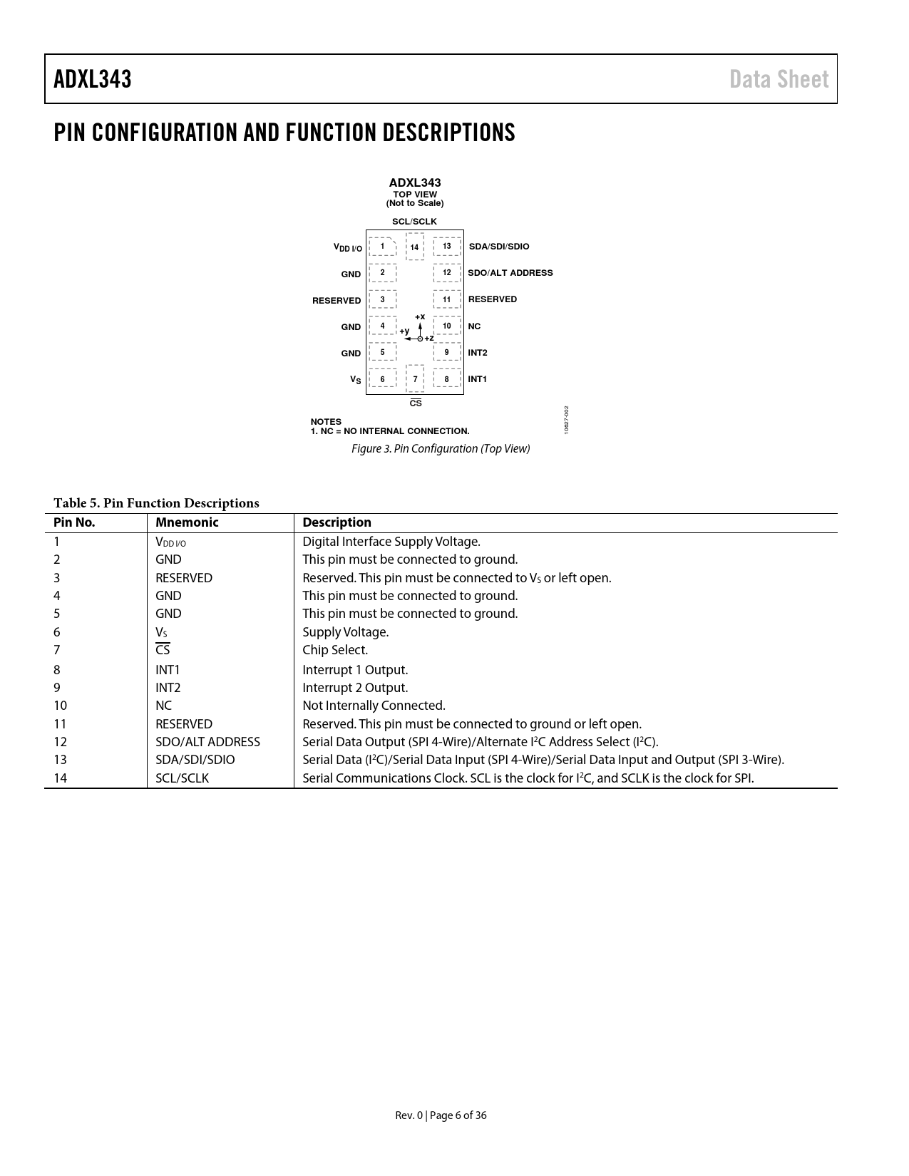 ADXL343Data SheetPIN CONFIGURATION AND FUNCTION DESCRIPTIONSADXL343TOP VIEW(Not to Scale)SCL/SCLKV11413SDA/SDI/SDIODD I/OGND212SDO/ALT ADDRESSRESERVED311RESERVED+xGND410NC+y+zGND59INT2V678INT1SCS 002 NOTES 1. NC = NO INTERNAL CONNECTION. 10627- Figure 3. Pin Configuration (Top View) Table 5. Pin Function Descriptions Pin No.MnemonicDescription 1 VDD I/O Digital Interface Supply Voltage. 2 GND This pin must be connected to ground. 3 RESERVED Reserved. This pin must be connected to VS or left open. 4 GND This pin must be connected to ground. 5 GND This pin must be connected to ground. 6 VS Supply Voltage. 7 CS Chip Select. 8 INT1 Interrupt 1 Output. 9 INT2 Interrupt 2 Output. 10 NC Not Internally Connected. 11 RESERVED Reserved. This pin must be connected to ground or left open. 12 SDO/ALT ADDRESS Serial Data Output (SPI 4-Wire)/Alternate I2C Address Select (I2C). 13 SDA/SDI/SDIO Serial Data (I2C)/Serial Data Input (SPI 4-Wire)/Serial Data Input and Output (SPI 3-Wire). 14 SCL/SCLK Serial Communications Clock. SCL is the clock for I2C, and SCLK is the clock for SPI. Rev. 0 | Page 6 of 36 Document Outline Features Applications General Description Functional Block Diagram Revision History Specifications Absolute Maximum Ratings Thermal Resistance Package Information ESD Caution Pin Configuration and Function Descriptions Typical Performance Characteristics Theory of Operation Power Sequencing Power Savings Power Modes Auto Sleep Mode Standby Mode Serial Communications SPI Preventing Bus Traffic Errors I2C Interrupts DATA_READY SINGLE_TAP DOUBLE_TAP Activity Inactivity FREE_FALL Watermark Overrun FIFO Bypass Mode FIFO Mode Stream Mode Trigger Mode Retrieving Data from FIFO Self-Test Register Map Register Definitions Register 0x00—DEVID (Read Only) Register 0x1D—THRESH_TAP (Read/Write) Register 0x1E, Register 0x1F, Register 0x20—OFSX, OFSY, OFSZ (Read/Write) Register 0x21—DUR (Read/Write) Register 0x22—Latent (Read/Write) Register 0x23—Window (Read/Write) Register 0x24—THRESH_ACT (Read/Write) Register 0x25—THRESH_INACT (Read/Write) Register 0x26—TIME_INACT (Read/Write) Register 0x27—ACT_INACT_CTL (Read/Write) ACT AC/DC and INACT AC/DC Bits ACT_x Enable Bits and INACT_x Enable Bits Register 0x28—THRESH_FF (Read/Write) Register 0x29—TIME_FF (Read/Write) Register 0x2A—TAP_AXES (Read/Write) Suppress Bit TAP_x Enable Bits Register 0x2B—ACT_TAP_STATUS (Read Only) ACT_x Source and TAP_x Source Bits Asleep Bit Register 0x2C—BW_RATE (Read/Write) LOW_POWER Bit Rate Bits Register 0x2D—POWER_CTL (Read/Write) Link Bit AUTO_SLEEP Bit Measure Bit Sleep Bit Wakeup Bits Register 0x2E—INT_ENABLE (Read/Write) Register 0x2F—INT_MAP (Read/Write) Register 0x30—INT_SOURCE (Read Only) Register 0x31—DATA_FORMAT (Read/Write) SELF_TEST Bit SPI Bit INT_INVERT Bit FULL_RES Bit Justify Bit Range Bits Register 0x32 to Register 0x37—DATAX0, DATAX1, DATAY0, DATAY1, DATAZ0, DATAZ1 (Read Only) Register 0x38—FIFO_CTL (Read/Write) FIFO_MODE Bits Trigger Bit Samples Bits 0x39—FIFO_STATUS (Read Only) FIFO_TRIG Bit Entries Bits Applications Information Power Supply Decoupling Mechanical Considerations for Mounting Tap Detection Threshold Link Mode Sleep Mode vs. Low Power Mode Offset Calibration Using Self-Test Data Formatting of Upper Data Rates Noise Performance Operation at Voltages Other Than 2.5 V Offset Performance at Lowest Data Rates Axes of Acceleration Sensitivity Layout and Design Recommendations Outline Dimensions Ordering Guide