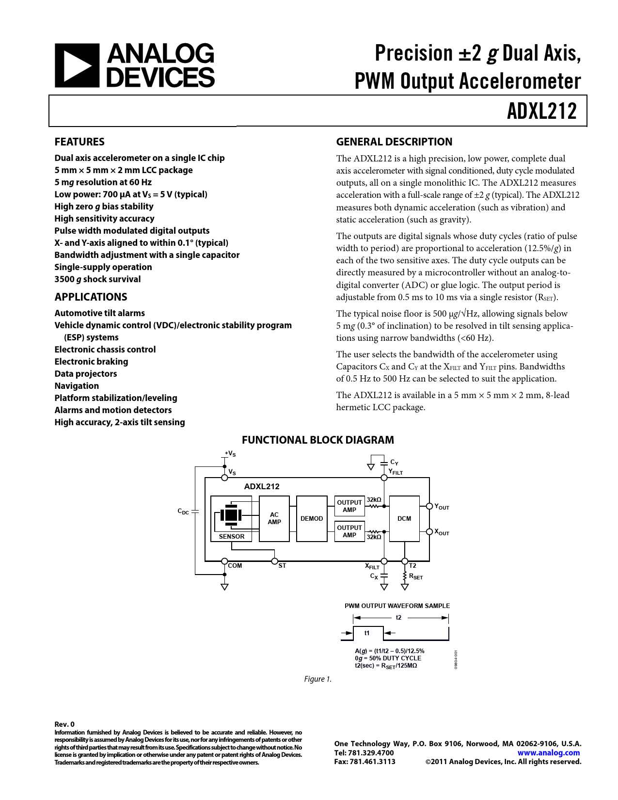 Precision ±2 g. Dual Axis,. PWM Output Accelerometer. ADXL212. FEATURES. GENERAL DESCRIPTION