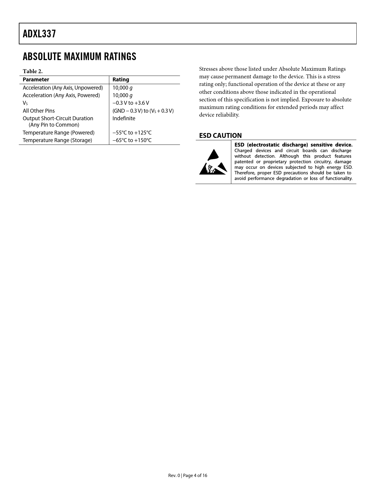 ADXL337 ABSOLUTE MAXIMUM RATINGS Table 2. Stresses above those listed under Absolute Maximum Ratings may cause permanent damage to the device. This is a stress Parameter Rating rating only; functional operation of the device at these or any Acceleration (Any Axis, Unpowered) 10,000 g other conditions above those indicated in the operational Acceleration (Any Axis, Powered) 10,000 g section of this specification is not implied. Exposure to absolute VS −0.3 V to +3.6 V maximum rating conditions for extended periods may affect All Other Pins (GND − 0.3 V) to (VS + 0.3 V) device reliability. Output Short-Circuit Duration Indefinite (Any Pin to Common) Temperature Range (Powered) −55°C to +125°C ESD CAUTION Temperature Range (Storage) −65°C to +150°C Rev. 0 | Page 4 of 16 Document Outline FEATURES APPLICATIONS GENERAL DESCRIPTION FUNCTIONAL BLOCK DIAGRAM TABLE OF CONTENTS REVISION HISTORY SPECIFICATIONS ABSOLUTE MAXIMUM RATINGS ESD CAUTION PIN CONFIGURATION AND FUNCTION DESCRIPTIONS TYPICAL PERFORMANCE CHARACTERISTICS THEORY OF OPERATION MECHANICAL SENSOR PERFORMANCE APPLICATIONS INFORMATION POWER SUPPLY DECOUPLING SETTING THE BANDWIDTH USING CX, CY, AND CZ SELF TEST DESIGN TRADE-OFFS FOR SELECTING FILTER CHARACTERISTICS: THE NOISE/BW TRADE-OFF USE WITH OPERATING VOLTAGES OTHER THAN 3 V AXES OF ACCELERATION SENSITIVITY LAYOUT AND DESIGN RECOMMENDATIONS OUTLINE DIMENSIONS ORDERING GUIDE