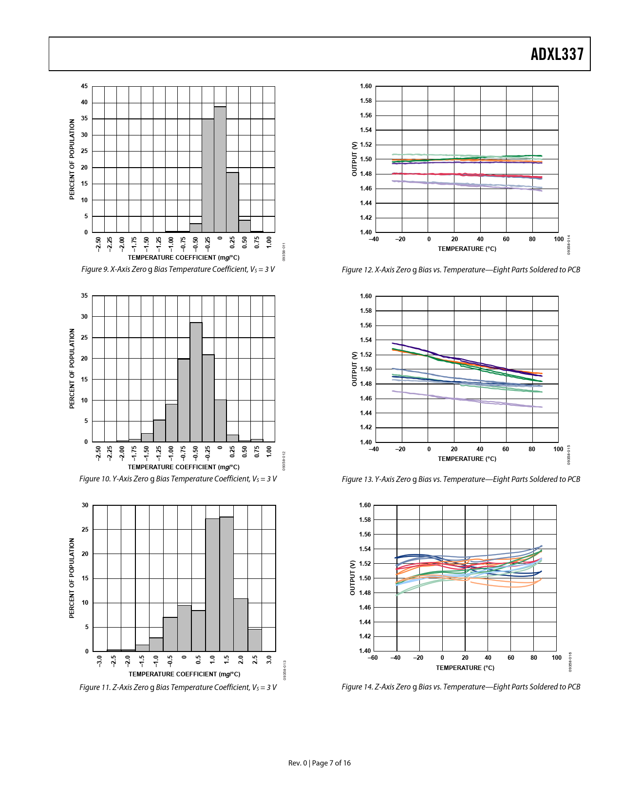 35 09 Figure 9. X-Axis Zero g Bias Temperature Coefficient, VS = 3 V Figure 12. X-Axis Zero g Bias vs. Temperature—Eight Parts Soldered to PCB