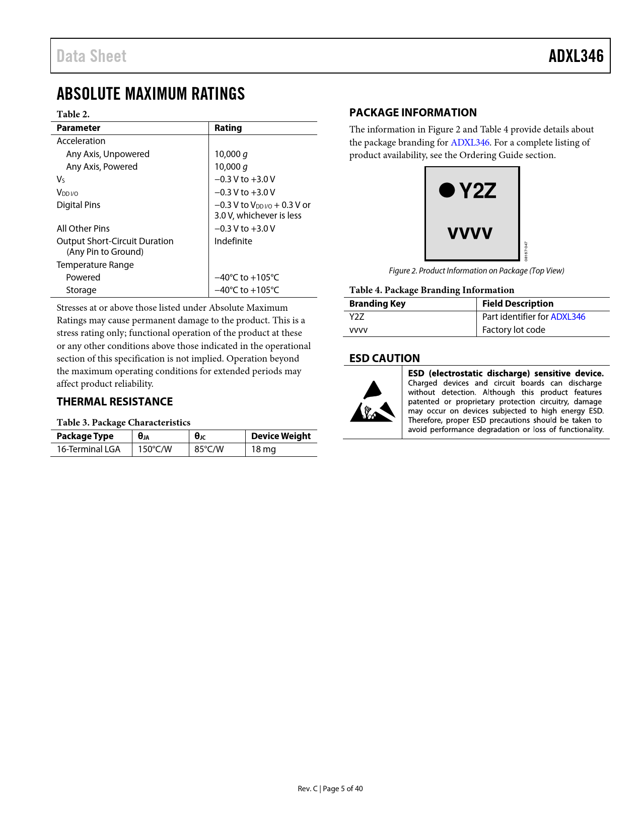link to page 6 link to page 6 link to page 40 Data SheetADXL346ABSOLUTE MAXIMUM RATINGS Table 2.PACKAGE INFORMATIONParameterRating The information in Figure 2 and Table 4 provide details about Acceleration the package branding for ADXL346. For a complete listing of Any Axis, Unpowered 10,000 g product availability, see the Ordering Guide section. Any Axis, Powered 10,000 g VS −0.3 V to +3.0 V VDD I/O −0.3 V to +3.0 V Y2Z Digital Pins −0.3 V to VDD I/O + 0.3 V or 3.0 V, whichever is less All Other Pins −0.3 V to +3.0 V vvvv Output Short-Circuit Duration Indefinite (Any Pin to Ground) 047 Temperature Range 08167- Figure 2. Product Information on Package (Top View) Powered −40°C to +105°C Storage −40°C to +105°C Table 4. Package Branding Information Stresses at or above those listed under Absolute Maximum Branding KeyField Description Ratings may cause permanent damage to the product. This is a Y2Z Part identifier for ADXL346 stress rating only; functional operation of the product at these vvvv Factory lot code or any other conditions above those indicated in the operational section of this specification is not implied. Operation beyond ESD CAUTION the maximum operating conditions for extended periods may affect product reliability. THERMAL RESISTANCETable 3. Package CharacteristicsPackage TypeθJAθJCDevice Weight 16-Terminal LGA 150°C/W 85°C/W 18 mg Rev. C | Page 5 of 40 Document Outline FEATURES APPLICATIONS GENERAL DESCRIPTION FUNCTIONAL BLOCK DIAGRAM TABLE OF CONTENTS REVISION HISTORY SPECIFICATIONS ABSOLUTE MAXIMUM RATINGS THERMAL RESISTANCE PACKAGE INFORMATION ESD CAUTION PIN CONFIGURATION AND FUNCTION DESCRIPTIONS TYPICAL PERFORMANCE CHARACTERISTICS THEORY OF OPERATION POWER SEQUENCING POWER SAVINGS Power Modes Autosleep Mode Standby Mode SERIAL COMMUNICATIONS SPI Preventing Bus Traffic Errors I2C INTERRUPTS DATA_READY Bit SINGLE_TAP Bit DOUBLE_TAP Bit Activity Bit Inactivity Bit FREE_FALL Bit Watermark Bit Overrun Bit Orientation Bit FIFO Bypass Mode FIFO Mode Stream Mode Trigger Mode Retrieving Data from FIFO SELF-TEST REGISTER MAP REGISTER DEFINITIONS Register 0x00—DEVID (Read Only) Register 0x1D—THRESH_TAP (Read/Write) Register 0x1E, Register 0x1F, Register 0x20—OFSX, OFSY, OFSZ (Read/Write) Register 0x21—DUR (Read/Write) Register 0x22—Latent (Read/Write) Register 0x23—Window (Read/Write) Register 0x24—THRESH_ACT (Read/Write) Register 0x25—THRESH_INACT (Read/Write) Register 0x26—TIME_INACT (Read/Write) Register 0x27—ACT_INACT_CTL (Read/Write) ACT AC/DC and INACT AC/DC Bits ACT_x Enable Bits and INACT_x Enable Bits Register 0x28—THRESH_FF (Read/Write) Register 0x29—TIME_FF (Read/Write) Register 0x2A—TAP_AXES (Read/Write) Improved Tap Bit Suppress Bit TAP_x Enable Bits Register 0x2B—ACT_TAP_STATUS (Read Only) ACT_x Source and TAP_x Source Bits Asleep Bit Register 0x2C—BW_RATE (Read/Write) LOW_POWER Bit Rate Bits Register 0x2D—POWER_CTL (Read/Write) Link Bit AUTO_SLEEP Bit Measure Bit Sleep Bit Wakeup Bits Register 0x2E—INT_ENABLE (Read/Write) Register 0x2F—INT_MAP (Read/Write) Register 0x30—INT_SOURCE (Read Only) Register 0x31—DATA_FORMAT (Read/Write) SELF_TEST Bit SPI Bit INT_INVERT Bit FULL_RES Bit Justify Bit Range Bits Register 0x32 to Register 0x37—DATAX0, DATAX1, DATAY0, DATAY1, DATAZ0, DATAZ1 (Read Only) Register 0x38—FIFO_CTL (Read/Write) FIFO_MODE Bits Trigger Bit Samples Bits Register 0x39—FIFO_STATUS (Read Only) FIFO_TRIG Bit Entries Bits Register 0x3A—TAP_SIGN (Read Only) xSIGN Bits xTAP Bits Register 0x3B—ORIENT_CONF (Read/Write) INT_ORIENT Bit Dead Zone Bits INT_3D Bit Divisor Bits Register 0x3C—Orient (Read Only) Vx Bits xD_ORIENT Bits APPLICATIONS INFORMATION POWER SUPPLY DECOUPLING MECHANICAL CONSIDERATIONS FOR MOUNTING TAP DETECTION IMPROVED TAP DETECTION TAP SIGN THRESHOLD LINK MODE SLEEP MODE VS. LOW POWER MODE OFFSET CALIBRATION USING SELF-TEST ORIENTATION SENSING DATA FORMATTING OF UPPER DATA RATES NOISE PERFORMANCE OPERATION AT VOLTAGES OTHER THAN 2.6 V OFFSET PERFORMANCE AT LOWEST DATA RATES AXES OF ACCELERATION SENSITIVITY LAYOUT AND DESIGN RECOMMENDATIONS OUTLINE DIMENSIONS ORDERING GUIDE