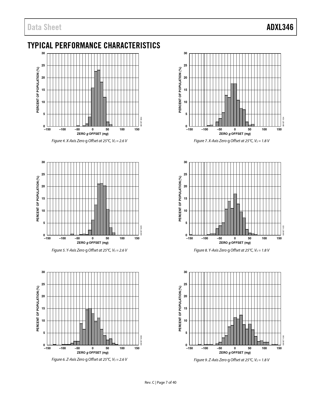 Data SheetADXL346TYPICAL PERFORMANCE CHARACTERISTICS30302525))%%((TION 2020TIONAALLPUPU1515POPOFFOOTT1010ENENCCPERPER55 004 104 08167- 00 08167- –150–100–50050100150–150–100–50050100150ZERO gOFFSET (mg)ZERO gOFFSET (mg) Figure 4. X-Axis Zero g Offset at 25°C, VS = 2.6 V Figure 7. X-Axis Zero g Offset at 25°C, VS = 1.8 V 30302525))%%((TION 20TION 20AALLPUPU1515POPOFFOOTT1010ENENCCPERPER55 005 105 08167- 0 08167- 0–150–100–50050100150–150–100–50050100150ZERO gOFFSET (mg)ZERO gOFFSET (mg) Figure 5. Y-Axis Zero g Offset at 25°C, VS = 2.6 V Figure 8. Y-Axis Zero g Offset at 25°C, VS = 1.8 V 30302525))%%((TION 20TION 20AALLPUPU1515POPOFFOOTT1010ENENCCPERPER55 006 106 08167- 0 08167- 0–150–100–50050100150–150–100–50050100150ZERO gOFFSET (mg)ZERO gOFFSET (mg) Figure 6. Z-Axis Zero g Offset at 25°C, VS = 2.6 V Figure 9. Z-Axis Zero g Offset at 25°C, VS = 1.8 V Rev. C | Page 7 of 40 Document Outline FEATURES APPLICATIONS GENERAL DESCRIPTION FUNCTIONAL BLOCK DIAGRAM TABLE OF CONTENTS REVISION HISTORY SPECIFICATIONS ABSOLUTE MAXIMUM RATINGS THERMAL RESISTANCE PACKAGE INFORMATION ESD CAUTION PIN CONFIGURATION AND FUNCTION DESCRIPTIONS TYPICAL PERFORMANCE CHARACTERISTICS THEORY OF OPERATION POWER SEQUENCING POWER SAVINGS Power Modes Autosleep Mode Standby Mode SERIAL COMMUNICATIONS SPI Preventing Bus Traffic Errors I2C INTERRUPTS DATA_READY Bit SINGLE_TAP Bit DOUBLE_TAP Bit Activity Bit Inactivity Bit FREE_FALL Bit Watermark Bit Overrun Bit Orientation Bit FIFO Bypass Mode FIFO Mode Stream Mode Trigger Mode Retrieving Data from FIFO SELF-TEST REGISTER MAP REGISTER DEFINITIONS Register 0x00—DEVID (Read Only) Register 0x1D—THRESH_TAP (Read/Write) Register 0x1E, Register 0x1F, Register 0x20—OFSX, OFSY, OFSZ (Read/Write) Register 0x21—DUR (Read/Write) Register 0x22—Latent (Read/Write) Register 0x23—Window (Read/Write) Register 0x24—THRESH_ACT (Read/Write) Register 0x25—THRESH_INACT (Read/Write) Register 0x26—TIME_INACT (Read/Write) Register 0x27—ACT_INACT_CTL (Read/Write) ACT AC/DC and INACT AC/DC Bits ACT_x Enable Bits and INACT_x Enable Bits Register 0x28—THRESH_FF (Read/Write) Register 0x29—TIME_FF (Read/Write) Register 0x2A—TAP_AXES (Read/Write) Improved Tap Bit Suppress Bit TAP_x Enable Bits Register 0x2B—ACT_TAP_STATUS (Read Only) ACT_x Source and TAP_x Source Bits Asleep Bit Register 0x2C—BW_RATE (Read/Write) LOW_POWER Bit Rate Bits Register 0x2D—POWER_CTL (Read/Write) Link Bit AUTO_SLEEP Bit Measure Bit Sleep Bit Wakeup Bits Register 0x2E—INT_ENABLE (Read/Write) Register 0x2F—INT_MAP (Read/Write) Register 0x30—INT_SOURCE (Read Only) Register 0x31—DATA_FORMAT (Read/Write) SELF_TEST Bit SPI Bit INT_INVERT Bit FULL_RES Bit Justify Bit Range Bits Register 0x32 to Register 0x37—DATAX0, DATAX1, DATAY0, DATAY1, DATAZ0, DATAZ1 (Read Only) Register 0x38—FIFO_CTL (Read/Write) FIFO_MODE Bits Trigger Bit Samples Bits Register 0x39—FIFO_STATUS (Read Only) FIFO_TRIG Bit Entries Bits Register 0x3A—TAP_SIGN (Read Only) xSIGN Bits xTAP Bits Register 0x3B—ORIENT_CONF (Read/Write) INT_ORIENT Bit Dead Zone Bits INT_3D Bit Divisor Bits Register 0x3C—Orient (Read Only) Vx Bits xD_ORIENT Bits APPLICATIONS INFORMATION POWER SUPPLY DECOUPLING MECHANICAL CONSIDERATIONS FOR MOUNTING TAP DETECTION IMPROVED TAP DETECTION TAP SIGN THRESHOLD LINK MODE SLEEP MODE VS. LOW POWER MODE OFFSET CALIBRATION USING SELF-TEST ORIENTATION SENSING DATA FORMATTING OF UPPER DATA RATES NOISE PERFORMANCE OPERATION AT VOLTAGES OTHER THAN 2.6 V OFFSET PERFORMANCE AT LOWEST DATA RATES AXES OF ACCELERATION SENSITIVITY LAYOUT AND DESIGN RECOMMENDATIONS OUTLINE DIMENSIONS ORDERING GUIDE