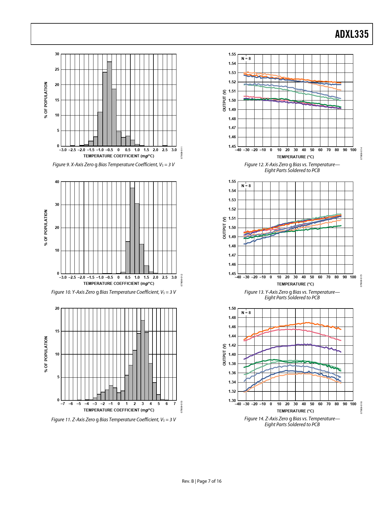 07 Figure 9. X-Axis Zero g Bias Temperature Coefficient, VS = 3 V Figure 12. X-Axis Zero g Bias vs. Temperature— Eight Parts Soldered to PCB