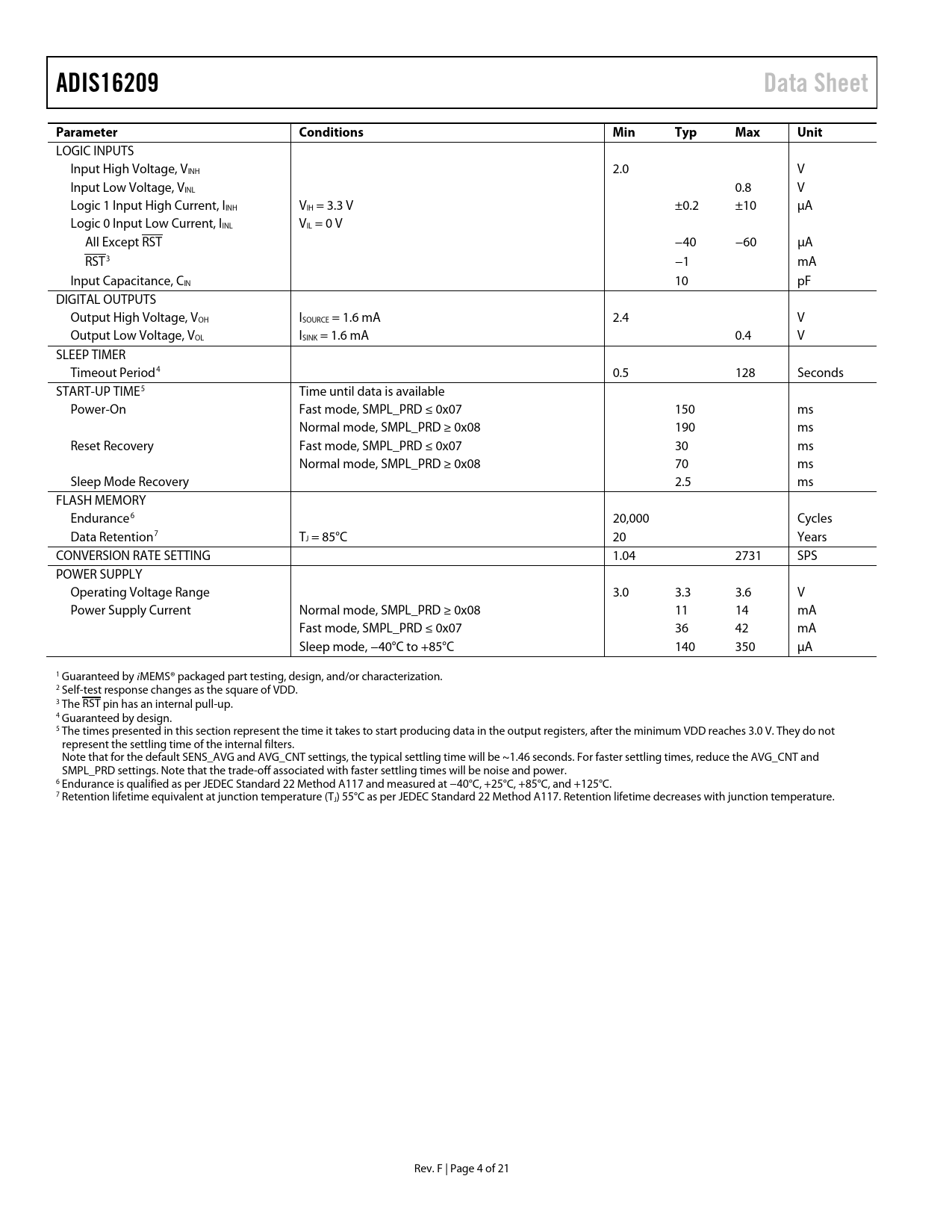 LOGIC INPUTS Input High Voltage, VINH 2.0 V Input Low Voltage, VINL 0.8 V Logic 1 Input High Current, IINH VIH = 3.3 V ±0.2 ±10 µA Logic 0 Input Low Current, IINL VIL = 0 V All Except RST −40 −60 μA RST3 −1 mA Input Capacitance, CIN 10 pF DIGITAL OUTPUTS Output High Voltage, VOH ISOURCE = 1.6 mA 2.4 V Output Low Voltage, VOL ISINK = 1.6 mA 0.4 V SLEEP TIMER Timeout Period4 0.5 128 Seconds START-UP TIME5 Time until data is available Power-On Fast mode, SMPL_PRD ≤ 0x07 150 ms Normal mode, SMPL_PRD ≥ 0x08 190 ms Reset Recovery Fast mode, SMPL_PRD ≤ 0x07 30 ms Normal mode, SMPL_PRD ≥ 0x08 70 ms Sleep Mode Recovery 2.5 ms FLASH MEMORY Endurance6 20,000 Cycles Data Retention7 TJ = 85°C 20 Years CONVERSION RATE SETTING 1.04 2731 SPS POWER SUPPLY Operating Voltage Range 3.0 3.3 3.6 V Power Supply Current Normal mode, SMPL_PRD ≥ 0x08 11 14 mA Fast mode, SMPL_PRD ≤ 0x07 36 42 mA Sleep mode, −40°C to +85°C 140 350 µA 1 Guaranteed by iMEMS® packaged part testing, design, and/or characterization. 2 Self-test response changes as the square of VDD. 3 The RST pin has an internal pull-up. 4 Guaranteed by design. 5 The times presented in this section represent the time it takes to start producing data in the output registers, after the minimum VDD reaches 3.0 V. They do not represent the settling time of the internal filters. Note that for the default SENS_AVG and AVG_CNT settings, the typical settling time wil be ~1.46 seconds. For faster settling times, reduce the AVG_CNT and SMPL_PRD settings. Note that the trade-off associated with faster settling times wil be noise and power. 6 Endurance is qualified as per JEDEC Standard 22 Method A117 and measured at −40°C, +25°C, +85°C, and +125°C. 7 Retention lifetime equivalent at junction temperature (TJ) 55°C as per JEDEC Standard 22 Method A117. Retention lifetime decreases with junction temperature. Rev. F | Page 4 of 21 Document Outline FEATURES APPLICATIONS FUNCTIONAL BLOCK DIAGRAM GENERAL DESCRIPTION REVISION HISTORY SPECIFICATIONS TIMING SPECIFICATIONS TIMING DIAGRAMS ABSOLUTE MAXIMUM RATINGS THERMAL RESISTANCE ESD CAUTION PIN CONFIGURATION AND FUNCTION DESCRIPTIONS RECOMMENDED PAD GEOMETRY TYPICAL PERFORMANCE CHARACTERISTICS THEORY OF OPERATION BASIC OPERATION OUTPUT DATA REGISTERS Accelerometers Horizontal Incline Angle Vertical Incline Angle Internal Temperature Power Supply Auxiliary ADC OPERATION CONTROL REGISTERS Internal Sample Rate Power Management Digital Filtering Digital I/O Lines Data-Ready I/O Indicator Self-Test General-Purpose I/O Auxiliary DAC Global Commands CALIBRATION REGISTERS ALARM REGISTERS Status APPLICATIONS INFORMATION POWER SUPPLY CONSIDERATIONS Power-On-Reset Function Transient Current from VDD Ramp Rate Filter Settling ASSEMBLY INTERFACE BOARD OUTLINE DIMENSIONS ORDERING GUIDE