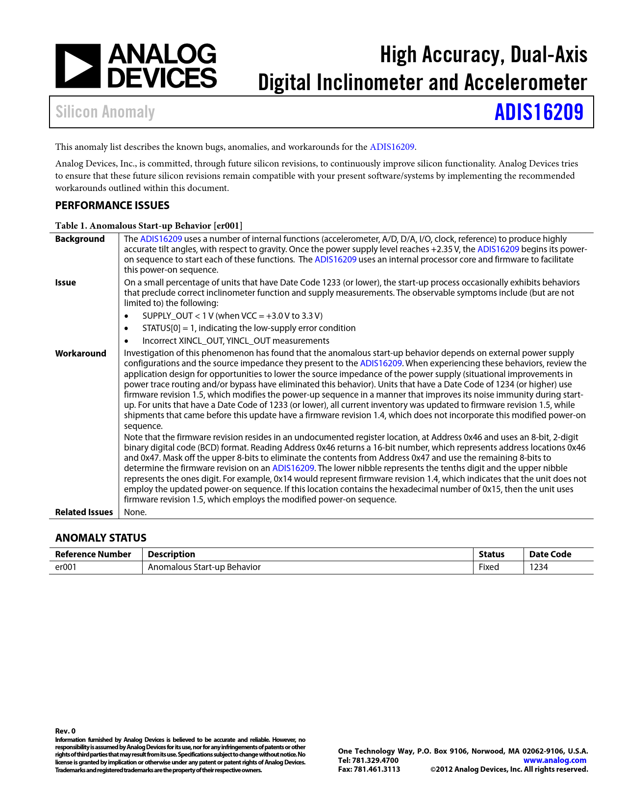 This anomaly list describes the known bugs, anomalies, and workarounds for the ADIS16209. Analog Devices, Inc., is committed, through future silicon revisions, to continuously improve silicon functionality. Analog Devices tries to ensure that these future silicon revisions remain compatible with your present software/systems by implementing the recommended workarounds outlined within this document.