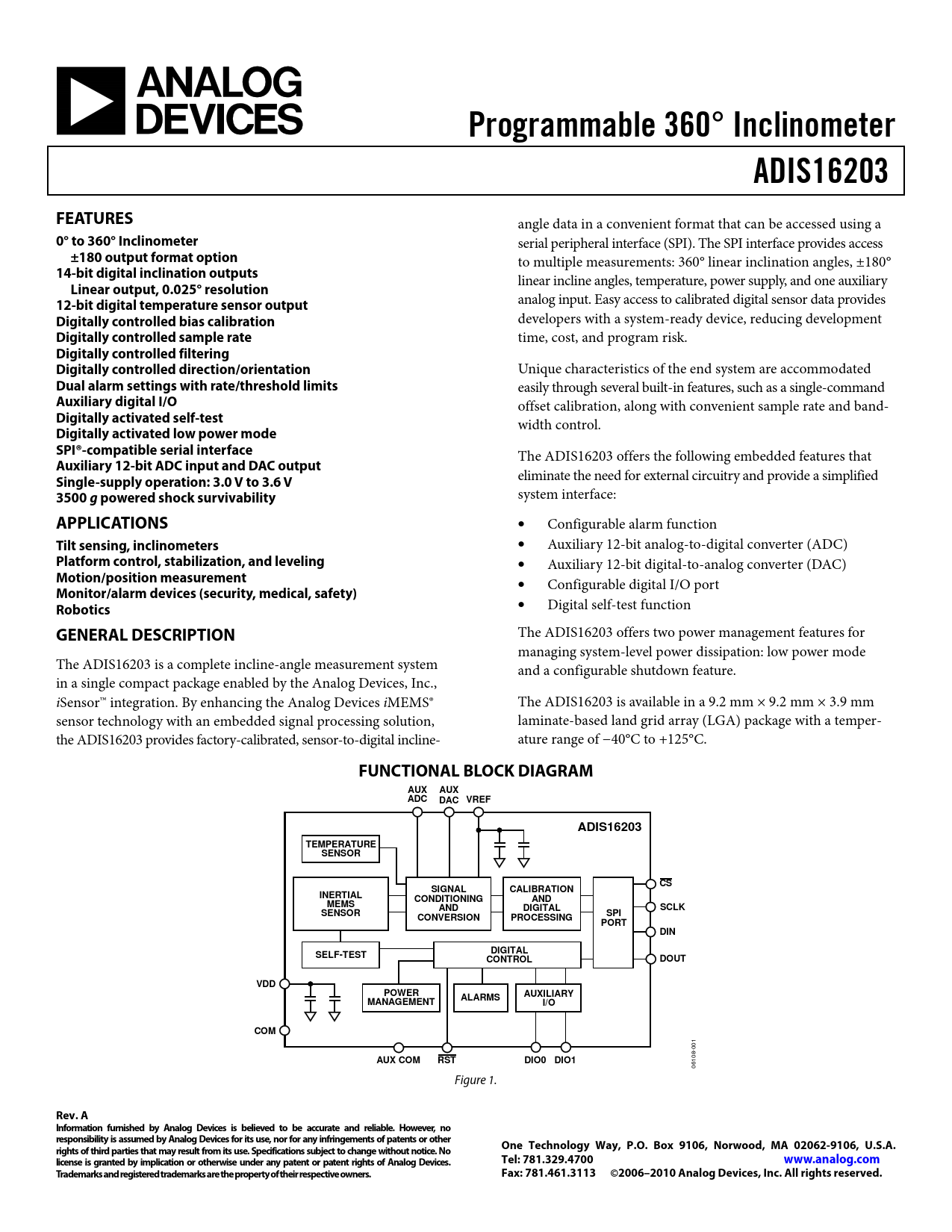 The ADIS16203 offers two power management features for managing system-level power dissipation: low power mode The ADIS16203 is a complete incline-angle measurement system and a configurable shutdown feature. in a single compact package enabled by the Analog Devices, Inc., iSensor™ integration. By enhancing the Analog Devices iMEMS® The ADIS16203 is available in a 9.2 mm × 9.2 mm × 3.9 mm sensor technology with an embedded signal processing solution, laminate-based land grid array (LGA) package with a temper- the ADIS16203 provides factory-calibrated, sensor-to-digital incline- ature range of −40°C to +125°C.
