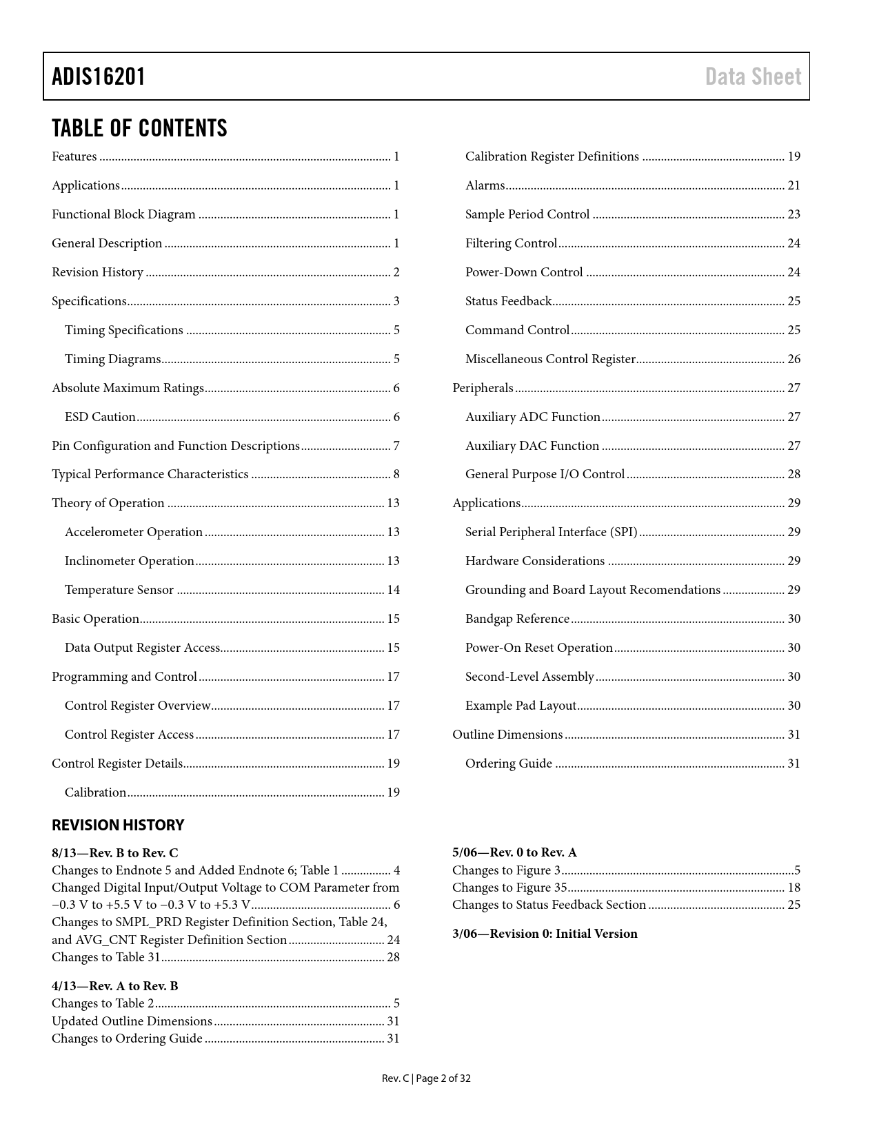ADIS16201 Data Sheet TABLE OF CONTENTS REVISION HISTORY 8/13—Rev B to Rev C 5/06—Rev 0 to Rev A