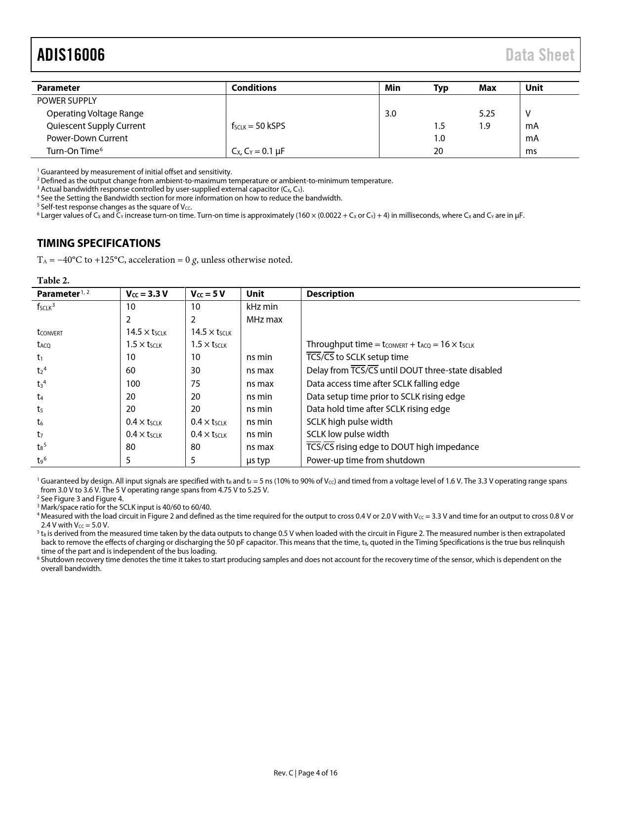 link to page 6 link to page 6 link to page 6 link to page 6 link to page 5 link to page 5 link to page 5 link to page 5 link to page 5 link to page 5 link to page 5 ADIS16006Data SheetParameterConditionsMinTypMaxUnit POWER SUPPLY Operating Voltage Range 3.0 5.25 V Quiescent Supply Current fSCLK = 50 kSPS 1.5 1.9 mA Power-Down Current 1.0 mA Turn-On Time6 CX, CY = 0.1 µF 20 ms 1 Guaranteed by measurement of initial offset and sensitivity. 2 Defined as the output change from ambient-to-maximum temperature or ambient-to-minimum temperature. 3 Actual bandwidth response controlled by user-supplied external capacitor (CX, CY). 4 See the Setting the Bandwidth section for more information on how to reduce the bandwidth. 5 Self-test response changes as the square of VCC. 6 Larger values of CX and CY increase turn-on time. Turn-on time is approximately (160 × (0.0022 + CX or CY) + 4) in milliseconds, where CX and CY are in µF. TIMING SPECIFICATIONS TA = −40°C to +125°C, acceleration = 0 g, unless otherwise noted. Table 2. Parameter 1, 2 VCC = 3.3 VVCC = 5 VUnitDescription f 3 SCLK 10 10 kHz min 2 2 MHz max tCONVERT 14.5 × tSCLK 14.5 × tSCLK tACQ 1.5 × tSCLK 1.5 × tSCLK Throughput time = tCONVERT + tACQ = 16 × tSCLK t1 10 10 ns min TCS/CS to SCLK setup time t 4 2 60 30 ns max Delay from TCS/CS until DOUT three-state disabled t 4 3 100 75 ns max Data access time after SCLK falling edge t4 20 20 ns min Data setup time prior to SCLK rising edge t5 20 20 ns min Data hold time after SCLK rising edge t6 0.4 × tSCLK 0.4 × tSCLK ns min SCLK high pulse width t7 0.4 × tSCLK 0.4 × tSCLK ns min SCLK low pulse width t 5 8 80 80 ns max TCS/CS rising edge to DOUT high impedance t 6 9 5 5 µs typ Power-up time from shutdown 1 Guaranteed by design. All input signals are specified with tR and tF = 5 ns (10% to 90% of VCC) and timed from a voltage level of 1.6 V. The 3.3 V operating range spans from 3.0 V to 3.6 V. The 5 V operating range spans from 4.75 V to 5.25 V. 2 See Figure 3 and Figure 4. 3 Mark/space ratio for the SCLK input is 40/60 to 60/40. 4 Measured with the load circuit in Figure 2 and defined as the time required for the output to cross 0.4 V or 2.0 V with VCC = 3.3 V and time for an output to cross 0.8 V or 2.4 V with VCC = 5.0 V. 5 t8 is derived from the measured time taken by the data outputs to change 0.5 V when loaded with the circuit in Figure 2. The measured number is then extrapolated back to remove the effects of charging or discharging the 50 pF capacitor. This means that the time, t8, quoted in the Timing Specifications is the true bus relinquish time of the part and is independent of the bus loading. 6 Shutdown recovery time denotes the time it takes to start producing samples and does not account for the recovery time of the sensor, which is dependent on the overall bandwidth. Rev. C | Page 4 of 16 Document Outline Features Applications General Description Functional Block Diagram Revision History Specifications Timing Specifications Circuit and Timing Diagrams Absolute Maximum Ratings ESD Caution Pin Configuration and Function Descriptions Typical Performance Characteristics Theory of Operation Accelerometer Data Format Self-Test Serial Interface Accelerometer Serial Interface Accelerometer Control Register Power-Down ADD0 ZERO ONE DONTC Accelerometer Conversion Details Temperature Sensor Serial Interface Read Operation Write Operation Temperature Sensor Control Register ZERO Output Data Format Temperature Sensor Conversion Details Power Supply Decoupling Setting the Bandwidth Selecting Filter Characteristics: The Noise/Bandwidth Trade-Off Applications Second Level Assembly Outline Dimensions Ordering Guide